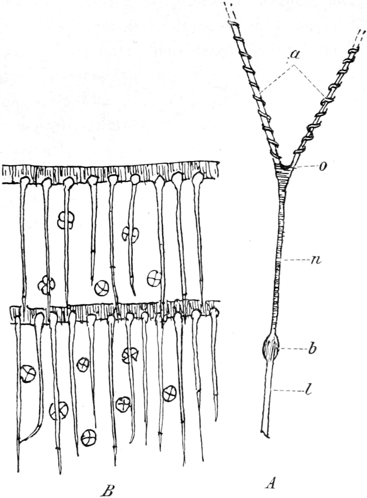 Der Körper dieser wegen der Art ihrer Bewegung „Wasserflöhe“, wegen der verzweigten Fühler (Hörner) „Cladocera“ genannten Entomostraken ist nicht in deutliche Segmente geteilt. Nicht einmal immer ist der Kopf durch einen kleinen Einschnitt vom Rumpfe abgesetzt. Letzterer ist oft von einer Schale umschlossen. In dieser Schale, deren Form die äusseren Umrisse des hinteren Körperteiles bedingt, liegt der Leib frei beweglich. Die beiden Hälften der Schale sind am Rücken mit einander verwachsen, auf der Oberfläche häufig mit feinen Skulpturen versehen und gewöhnlich so durchsichtig, dass man die inneren Organe beobachten kann. Nicht immer ist der Leib ganz in der Schale verborgen, sondern oft nur zu einem ganz geringen Teil davon überdeckt. In wenigen Fällen fehlt jede Andeutung einer Schale. Am Kopfe stehen wie zwei Hörnchen die hinteren zweiästigen Fühler empor, welche zum Schwimmen dienen. Das erste Paar ist zu kurzen Stummeln rückgebildet, welche als Sinnesorgan mit sehr feinen perzipierenden Apparaten ausgestattet sind und beim Männchen zugleich als Greiforgan funktionieren. Von Mundteilen besitzen die Wasserflöhe jederseits einen Ober- und einen Unterkiefer. Die Beinpaare sind wie bei den Copepoden zweiästig. Der äussere Ast ist blattförmig verbreitert und vertritt die Stelle von Kiemen. Die Zahl der Beinpaare schwankt zwischen vier und sechs. Die das Zentralnervensystem darstellende Ganglienkette hat, da die Knoten sehr nahe zusammenrücken, nur eine geringe Länge. Auffallend gross und schön ist das einen bedeutenden Teil des Kopfes ausfüllende Auge. Es ist in einem beständigen Zittern begriffen und besteht eigentlich aus zwei verwachsenen Teilen. Ohne besondere Mühe vermag man die daran sich ansetzenden Muskeln und Nerven zu sehen. Die lichtbrechenden Körper (Linsen) glänzen sehr schön und heben sich scharf vom Pigment der inneren Teile[S. 367] des Auges ab. Bei den meisten Arten verläuft der Darm gerade durch den Körper und nur in wenigen Fällen bildet er eine Schlinge. Noch im Kopfteil entspringen an seiner Oberseite zwei gegen die Augen vorspringende kurze Schläuche, in welchen die Leberzellen untergebracht sind.