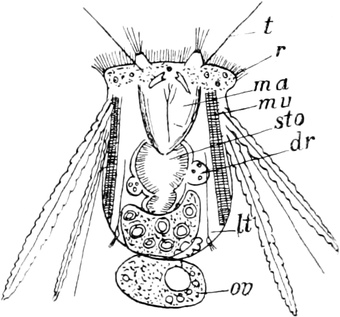 Über die Befruchtungserscheinungen am Eie hat Weismann[122] eine Reihe gründlicher Untersuchungen angestellt. Die Wasserflöhe verlassen das Ei in einer Gestalt, welche der der erwachsenen Tiere schon sehr ähnlich ist, machen also kein freilebendes Cyclopsstadium durch.