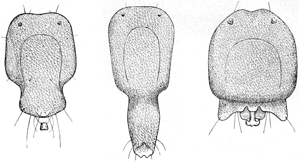 Im Müskendorfer See bei Konitz in Westpreussen fand ich 1886 zahllose Exemplare einer merkwürdigen Varietät der Hyalodaphnia cucullata, deren Kopfteil sichelartig gekrümmt und ventralwärts stark herabgebogen ist. Diese Form (var. nov. procurva Poppe) kommt lediglich in dem genannten See vor[123] und ist anderwärts bis jetzt nicht aufgefunden worden. Manche Abweichungen geringern Grades vom Typus der Art sind für gewisse Fundorte überhaupt charakteristisch.