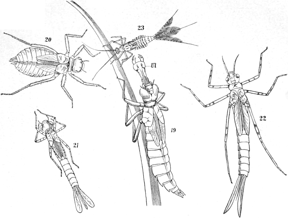 Limnophilus, Polycentropus, Hydropsyche. — b) Sialis, Sisyra. —
