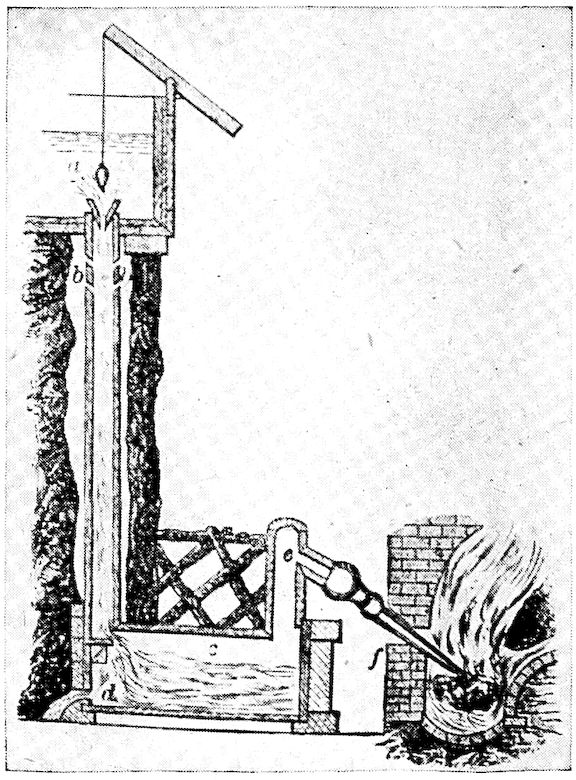 But the real forerunner of our modern blast furnace was the Catalan forge, developed in and named from Catalonia, north Spain, where it originated. The Catalan, however, and all of such crude early furnaces, including those thus far described, produced a variable kind of what we now know as “wrought iron,” and our modern “cast” iron did not appear until about 1350 when, with larger furnaces, an excess of charcoal, with greater heat and other favorable conditions, the Germans found that the pasty, difficultly melting metal could be made to absorb carbon enough to make it easily fusible. This was the secret.