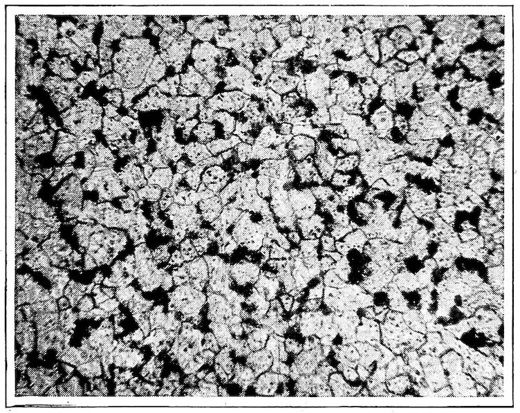 As stated before, freezing is not an instantaneous but a progressive process. During the freezing period of any of these alloys which have over 1.7% of carbon the still liquid portion which remains after freezing begins to become smaller and smaller in quantity as freezing progresses just as it did in alloys of the “solid solution” group. And as Nature allows a concentration of 4.3% of carbon as the highest concentration at the minimum temperature the very last of the remaining liquid of every alloy eventually gets 340to this eutectic composition just before the alloy freezes. Those to the left of the eutectic or exact 4.3% composition do so by the gradual freezing out of iron containing the maximum or 1.7% of carbon, i.e., iron is taken out faster than carbon, hence there is gradual concentration of carbon in the remaining liquid. This goes on until 4.3% is reached. The compositions to the right of the line WX throw out the chemical compound, Fe3C, which contains 6.6% of carbon, whereby carbon is eliminated faster than iron and the desired 4.3% carbon alloy is arrived at from the other direction.