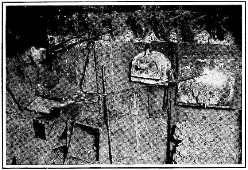 But from our modern viewpoint those early iron furnaces were queer things. The first were little more than piles of ore and wood or charcoal on the tops of hills where a brisk wind would make a hot fire. Later, with the invention of the crudest of bellows, the smelting was done in small holes in the side of banks of clay, charcoal made from the forest trees being used as fuel. Indeed, some of these types of furnaces still exist and are so operated to-day in neglected districts in Western India and elsewhere, producing their little five to 100 pound balls of iron after several hours of tedious work.