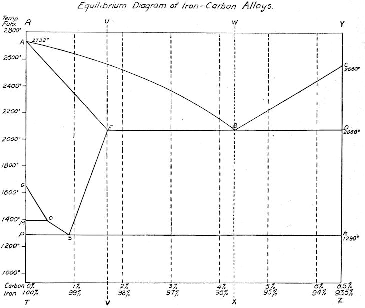 Referring to the freezing-point diagram on page 336, the upper or broad V-shaped line, ABC, indicates the temperatures at which the alloys of various percentages of iron and carbon begin to freeze, and the lower one, AED, the temperatures at which the freezing of these alloys ends. From the diagram it is readily seen that pure iron (100%), has a very high freezing-point and solidifies at once. Iron which contains about 2% of carbon begins to freeze at a much lower temperature and has a long period of solidification, while iron with 4.3% of carbon has the lowest freezing-point of the series with an extremely short solidification period or range.
