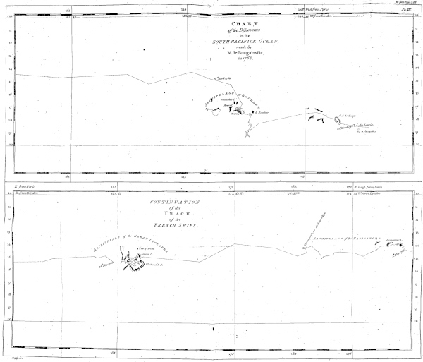 Mr. de Bougainville’s work abounds in marine phrases, which makes the translation of it very difficult, even to a native; but a foreigner, and a man unacquainted with nautical affairs, must be under still greater difficulties: we should have been under this predicament, had it not been for the kind assistance xof two worthy friends, who not only enabled us to do justice to the original, but also to make the whole intelligible to men conversant with navigation: it is therefore no more than justice to acknowledge this favour publicly[1].