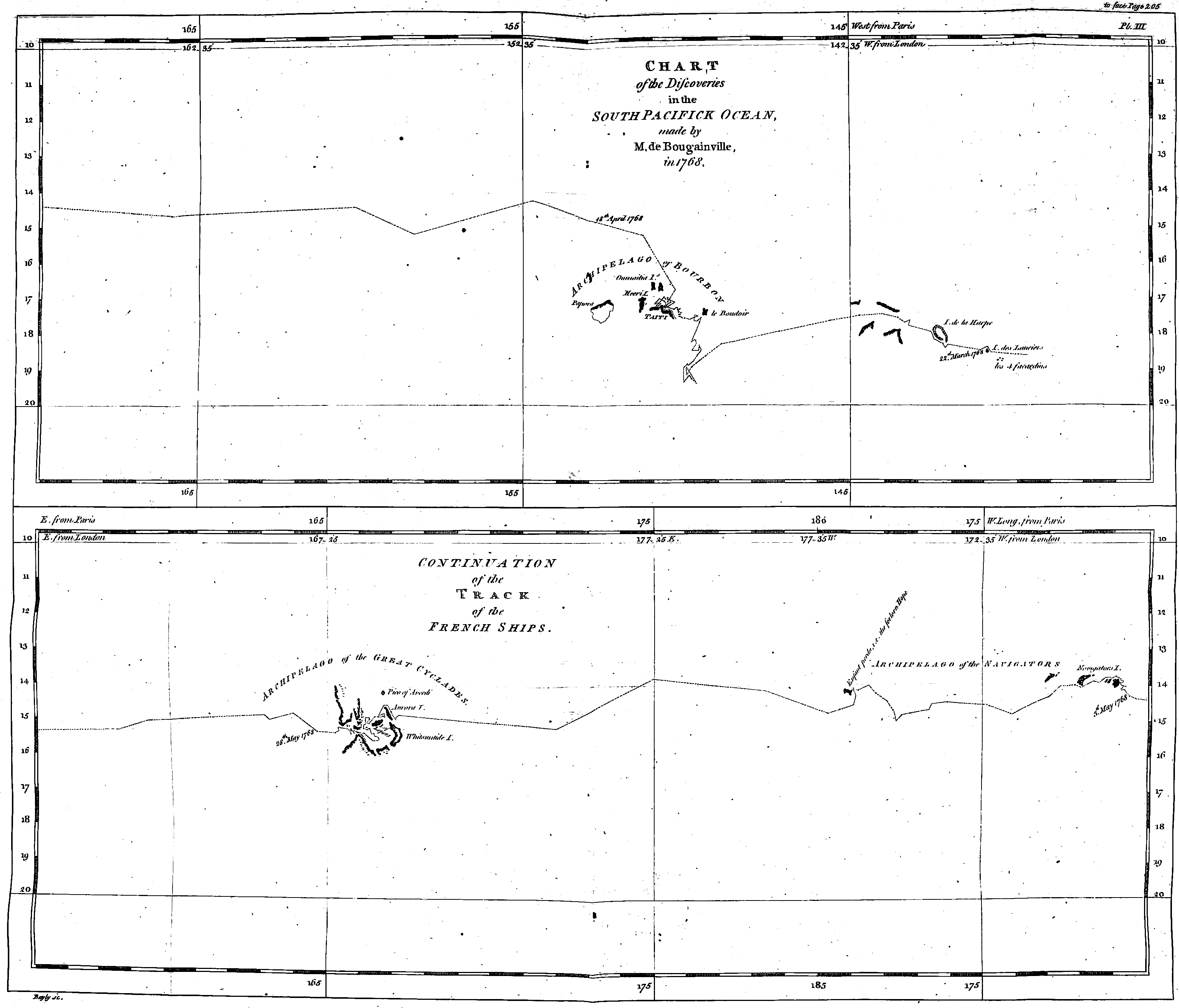 Two months after commodore Byron’s return, captain Wallace sailed from England, with the Dolphin and Swallow sloops; he went through the straits of Magalhaens, and as he entered the South Seas, he was separated from the Swallow, commanded by captain Carteret; he discovered an isle in about 18°, some time in August, 1767: he sailed up to the Line, passed near Papua, arrived at Batavia in January, 1768, touched at the Cape of Good Hope, and returned to England in May the same year.