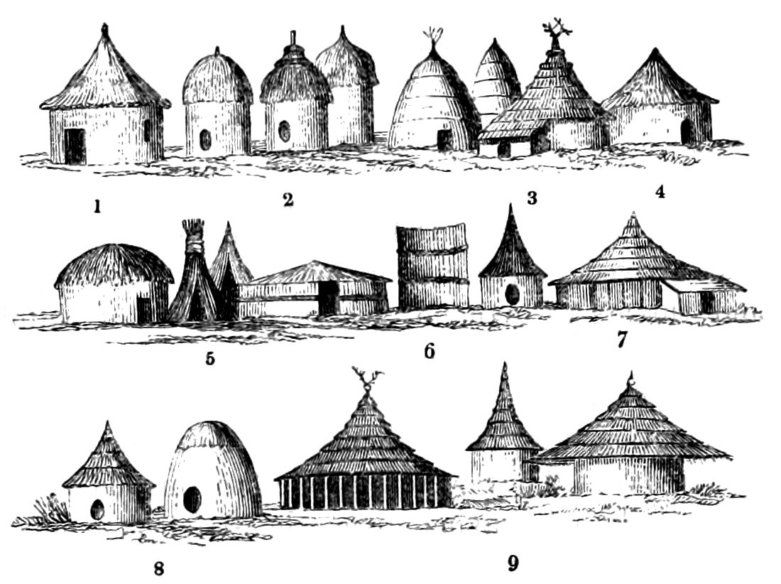 To judge from the ground inclining gently, as if in a flat dish, and from those trees, forming the arch from N.N.W. to S.W., being the forerunners of a thicker Haba, a very large lake must be filled here at high water. The greatest part of the water is afterwards let off, for the sake of fishing, through the before-named canal. An immeasurable quantity of water, generally, is collected in the low lands, according to all the appearances which I myself have found of such ponds in my short excursions into the neighbourhood.[299] These always exercise a lasting effect on the lower height of the water of the White Stream, by their nearly simultaneous draining off, whilst they contribute mostly during the inundation to the sudden swelling of the White Stream by their connection with it. The tokuls of this village, which is called Auan or Auwan, are not badly built, but have low walls; the point of the roof also is not high. The lower wall, being of reeds, and plastered with Nile slime, is only three and a half or four feet high. The door is square here instead of the usual oval form; it is constructed of reeds, and before it are two stakes fixed in the ground, supporting a cross stake. Almost all the tokuls have a little porch before this door, which is covered by the roof being extended over it. The outer door is therefore lower than the inner one, and the inmates are compelled to crawl into the house. Generally, on the White Nile, it is necessary to stoop very much to enter the tokuls. The roof is indented according to the length of the straw bound up in hoops, and to the height of the roof itself; it has from five to eight separations. The point of the roof is covered, as I before remarked, by a gourd-shell, opening at the top and bottom, and forms a broad ring, in which the slender beams join.