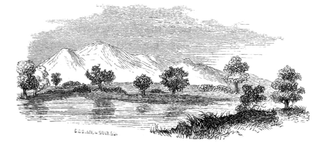 Three o’clock. On the left an island, and the[344] other arm embracing it, divides immediately a whole troop of people, with their bullocks, from our road; but there are huts and blacks enough on the island itself. We go W., and the mountain lies S.W. of us, as it appears, in its entire longitudinal profile, although we could not distinguish clefts or precipices. The scarpe, on the southern side, ascends to a height nearly equal to one of the ridges, makes a concave vibration towards this, and falls gently to the west on a break, rising precipitously only a little above the horizon. We see even from here that it is a mountain of moderate size.