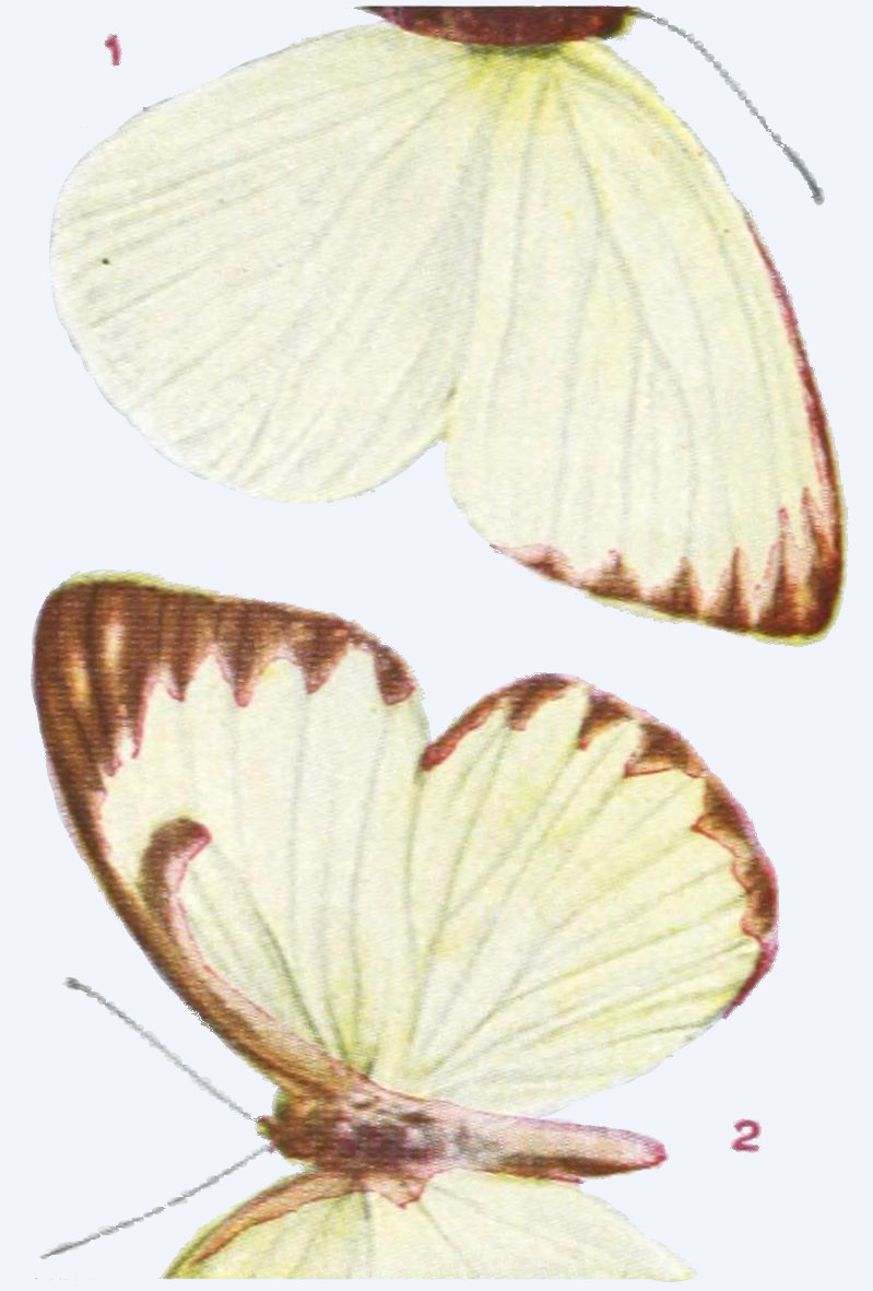 The wings consist of a framework of horny tubes which are in reality double, the inner tube being filled with air, the outer tube with blood. The blood of insects is not, like that of vertebrates, red in color. It is almost colorless, or at most slightly stained with yellow. The circulation of the blood in the outer wall of the wing-tubes takes place most freely during the brief period in which the insect is expanding its wings after emergence from the chrysalis, concerning which we shall have more to say elsewhere. After the wings of the butterfly have become fully expanded, the circulation of the blood in the wings ceases almost entirely. The horny tubes, which compose the framework of the wings of butterflies, support between them a delicate membrane, to which upon both the upper and lower sides are attached the scales. The two fore wings are more or less triangular in outline; the hind wings are also subtriangular, but are generally more or less rounded on the outer margin, and in numerous forms are provided with tails or tail-like prolongations.