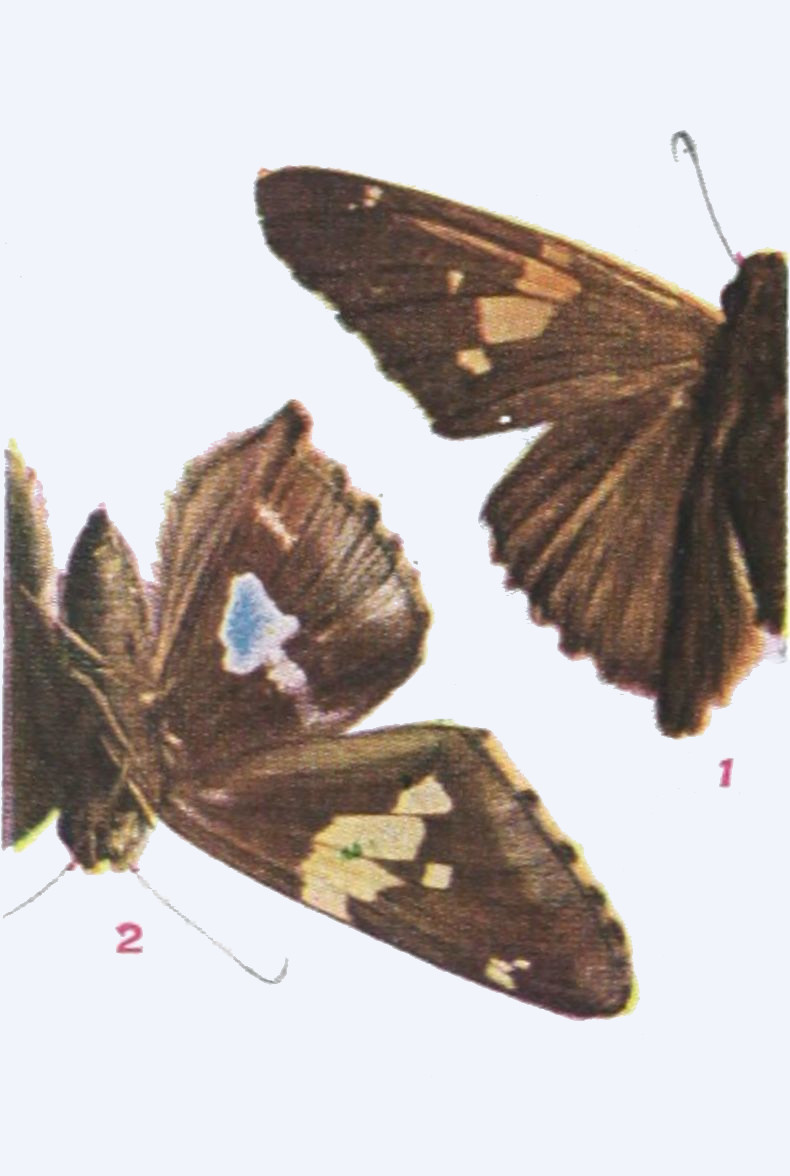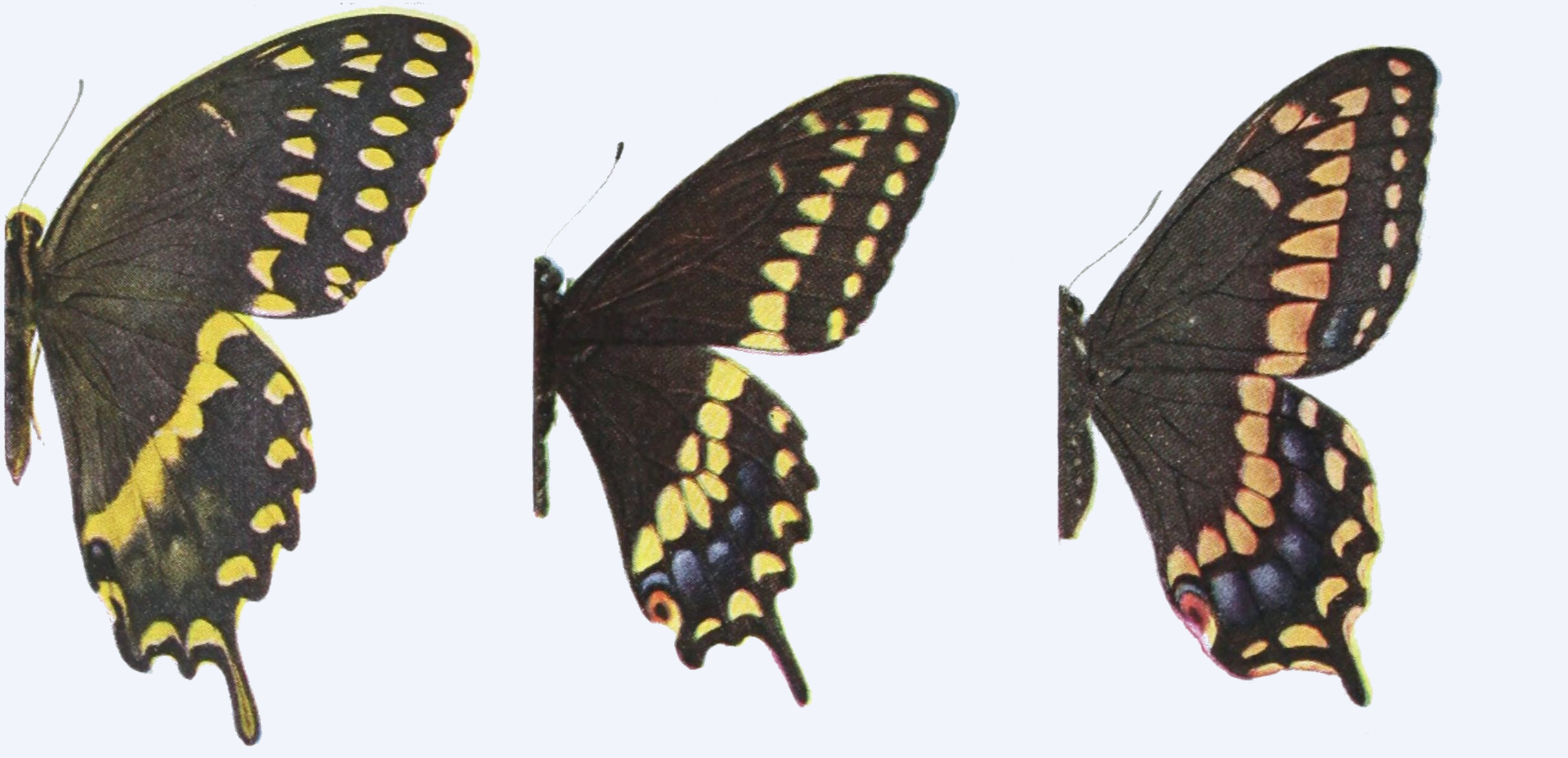The internal organs of reproduction in the female consist of the ovaries, from which the eggs pass by way of the oviduct to the ovipositor, which in butterflies is not so conspicuous or remarkable an organ as is the case in many other insects. Communicating with the oviduct are the spermatothecæ, which are receptacles in which is retained the fertilizing fluid received from the male at the time of coition. As the eggs, one by one, are passed from the ovaries into the oviduct, they are impregnated through absorption of the spermatozoa, which enter their walls, imparting to them vitality. The internal organs of the male are tubular vesicles, or testes, which secrete the seminal fluid, which by means of the intromittent organ is introduced into the spermatothecæ of the female. Union between the sexes among insects generally takes place but once, and is not recurrent. The female, having been impregnated, proceeds at once to lay her eggs upon the tender leaves or the bark of the plants upon which her progeny are to be nourished, and then promptly dies. The life of insects in the winged form is usually very brief. Inasmuch as there are great differences between the sexes in insects alike in size, form, color, and markings, it is well for the collector to carefully preserve specimens which may be captured in copulation. Such specimens should be designated as “Taken in coitu.” The writer in such cases uses the formula “A ♂ in coitu with B ♀,” which is put in minute handwriting upon a label and placed upon the pin bearing the male insect. Upon the pin carrying the female insect there is put the label “B ♀ in coitu with A ♂.” The finding of insects in copula is sometimes the only way in which to definitely settle the question of sexual relationship between forms. So different are some insects that the two sexes have in a number of cases been described by early writers as belonging not merely to different species, but to different genera, and even families.