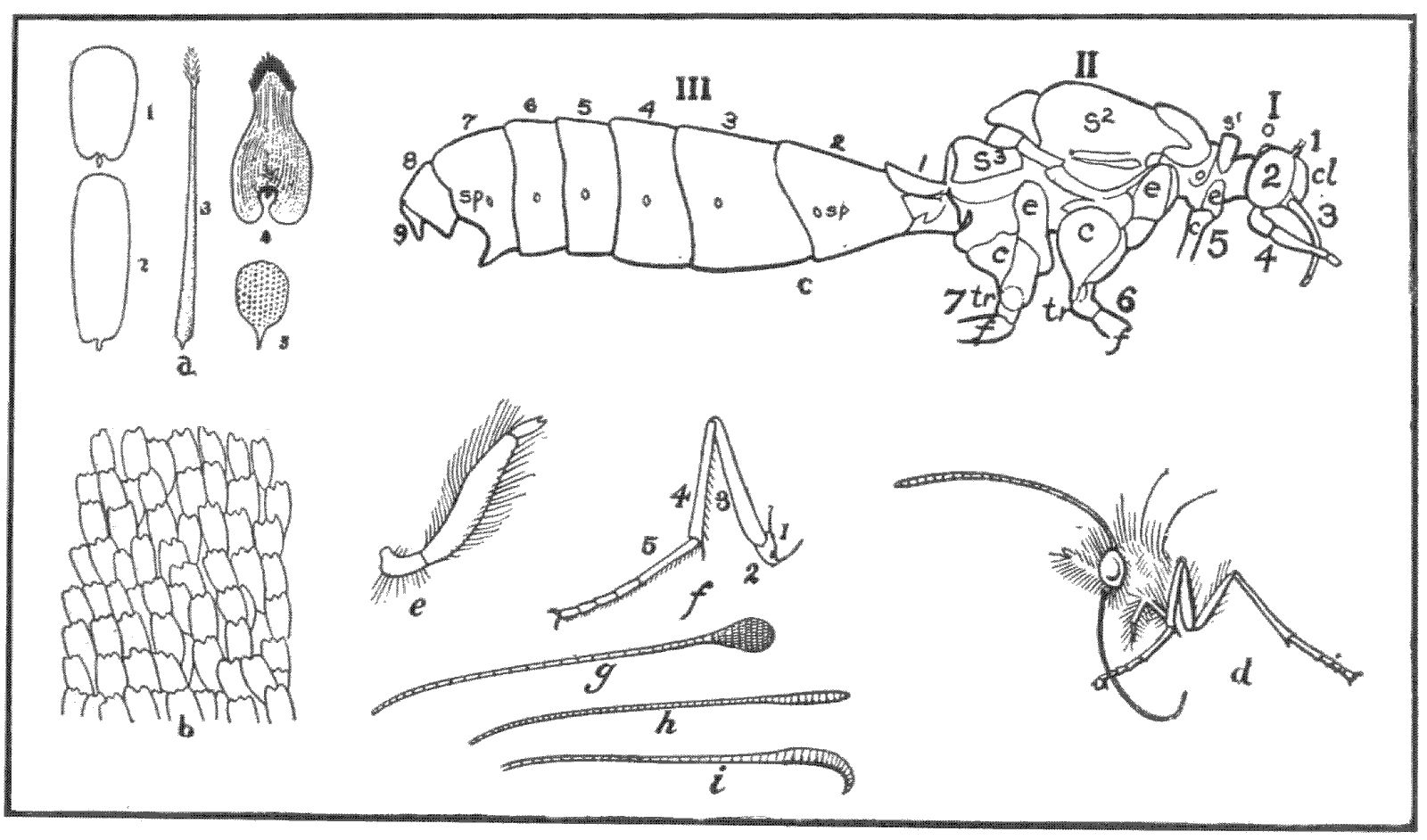 | I. | Head. 1, antenna; 2, eye; 3, proboscis; 4, palpus; cl. clypeus; o, occiput. | |