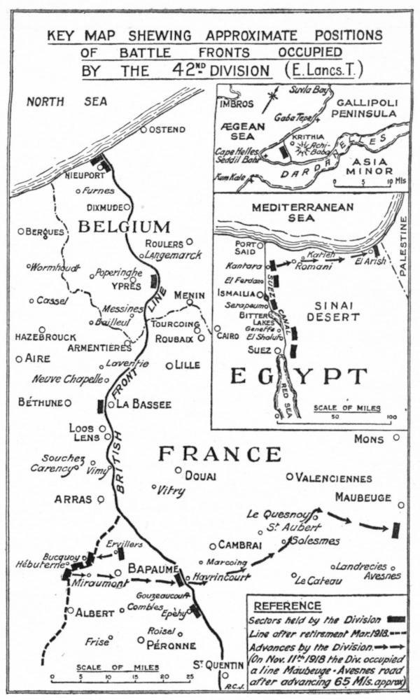 KEY MAP SHEWING APPROXIMATE POSITIONS OF BATTLE FRONTS OCCUPIED BY THE 42ND DIVISION (E. Lancs. T.)