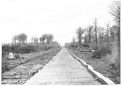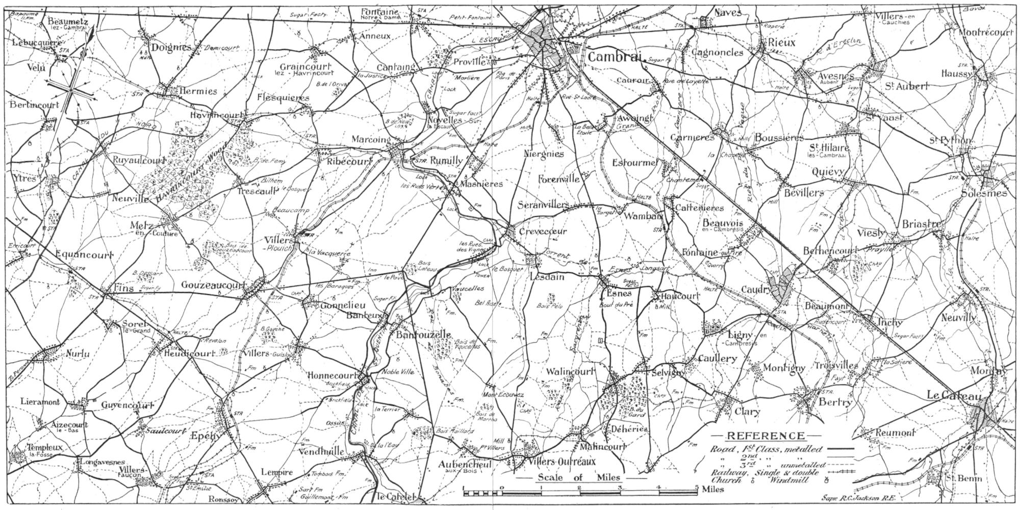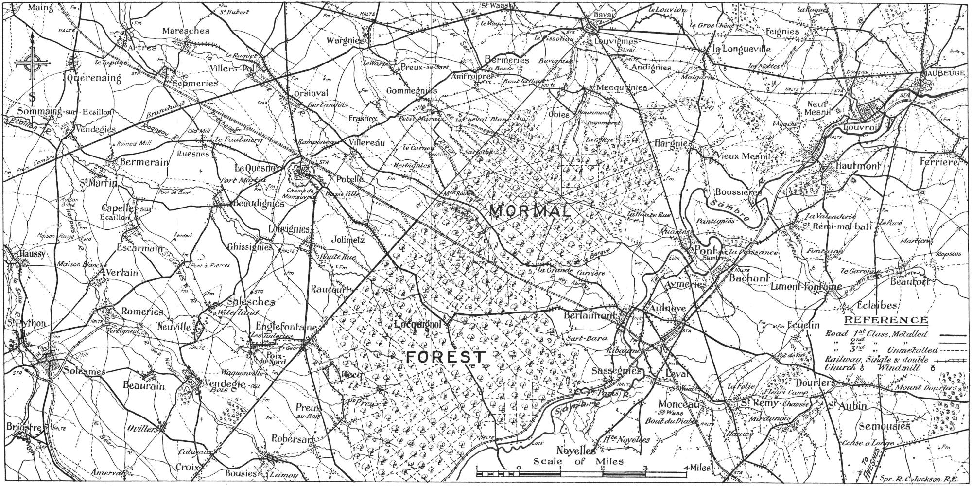 [24] The Forêt de Mormal, covering more than thirty-four square miles, is referred to by Field-Marshal Viscount French, in his book “1914,” as a serious obstacle to his retiring army. It was a still greater obstacle to the Advance of November 1918, as by that time the roads had undergone four years’ heavy wear, without repairs, and there was no material other than logs and fascines that could be used in the work of making deviations round the huge craters.