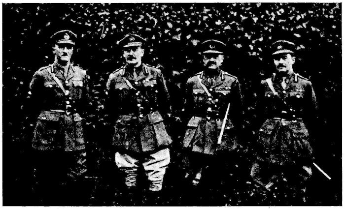 LEFT TO RIGHT: BRIG.-GEN. F. W. H. WALSHE, C.M.G., D.S.O., C.R.A.; MAJOR-GEN. A. SOLLY-FLOOD, C.B., C.M.G., D.S.O., COMMANDING 42ND DIVISION; BRIG.-GEN. H. FARGUS, C.B., C.M.G., D.S.O.; BRIG.-GEN. THE HON. A. M. HENLEY, C.M.G., D.S.O.