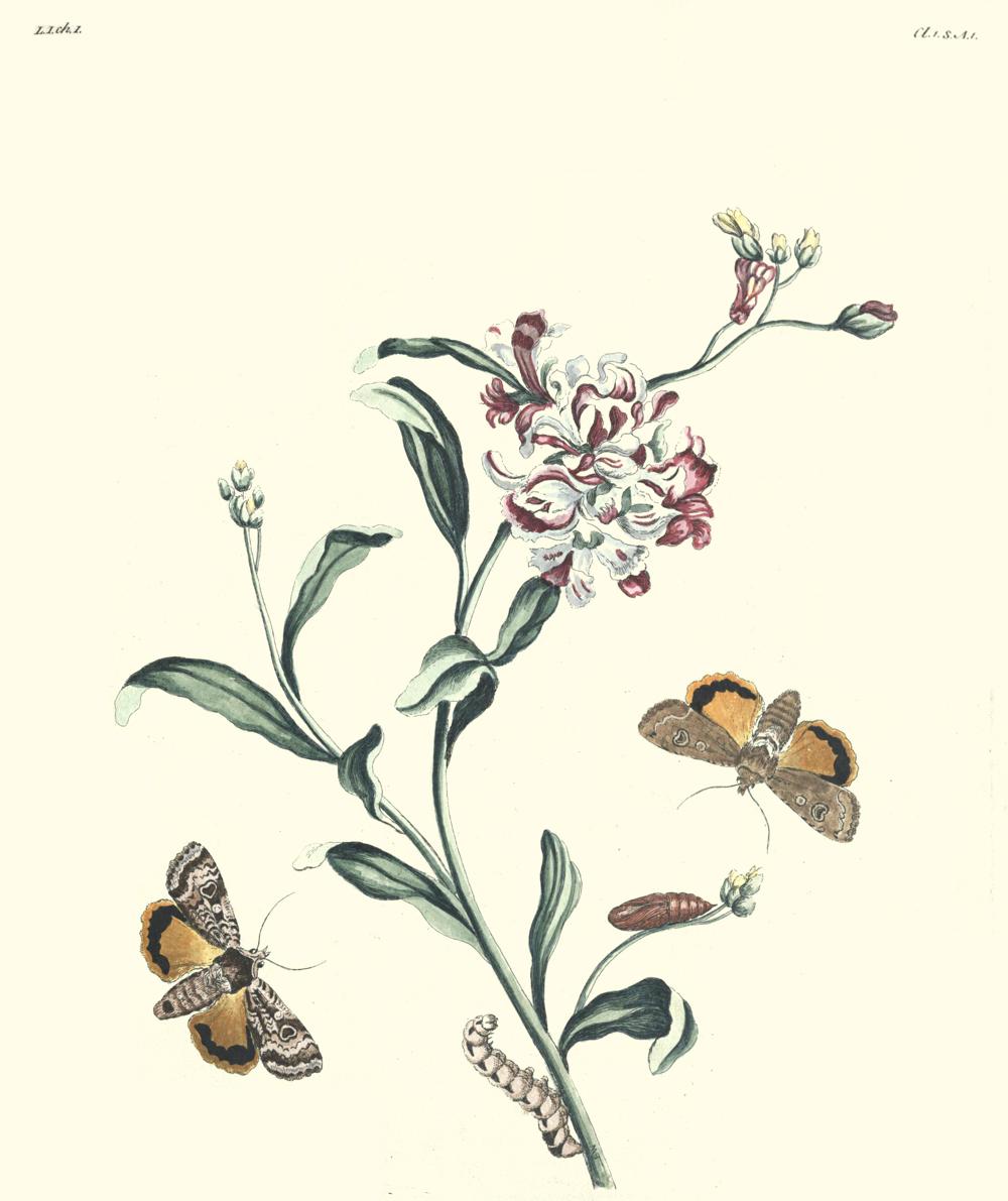 It happened that a Friend invited him one Evening, to bear him Company to a Society named the Aurelian: the agreeable Purpose of which is, to become acquainted with that Part of Natural Philosophy which relates to the Generation and Properties of Insects, of which they have a fine Collection. And here he first saw such Specimens of Nature’s admirable Skill in the Disposition, Arrangement, and contrasting of Colours (particularly amongst the Moths and Butterflies) as struck him with Amazement, and convinced him, at the same Time, that studying them would turn greatly to his Advantage.