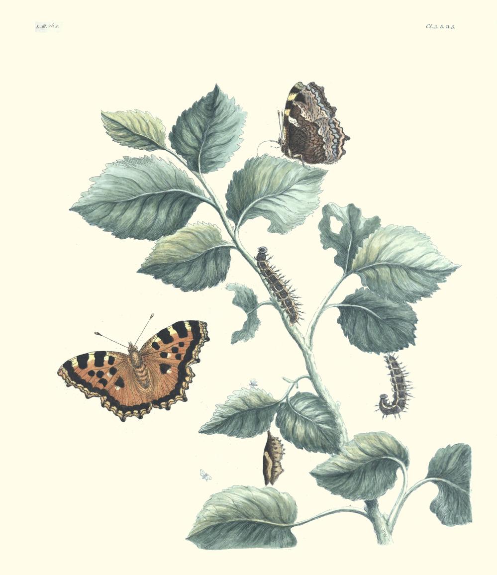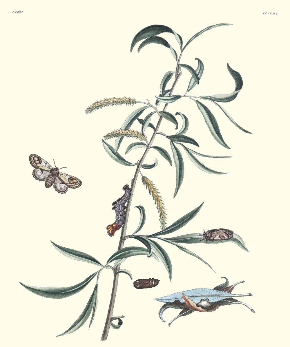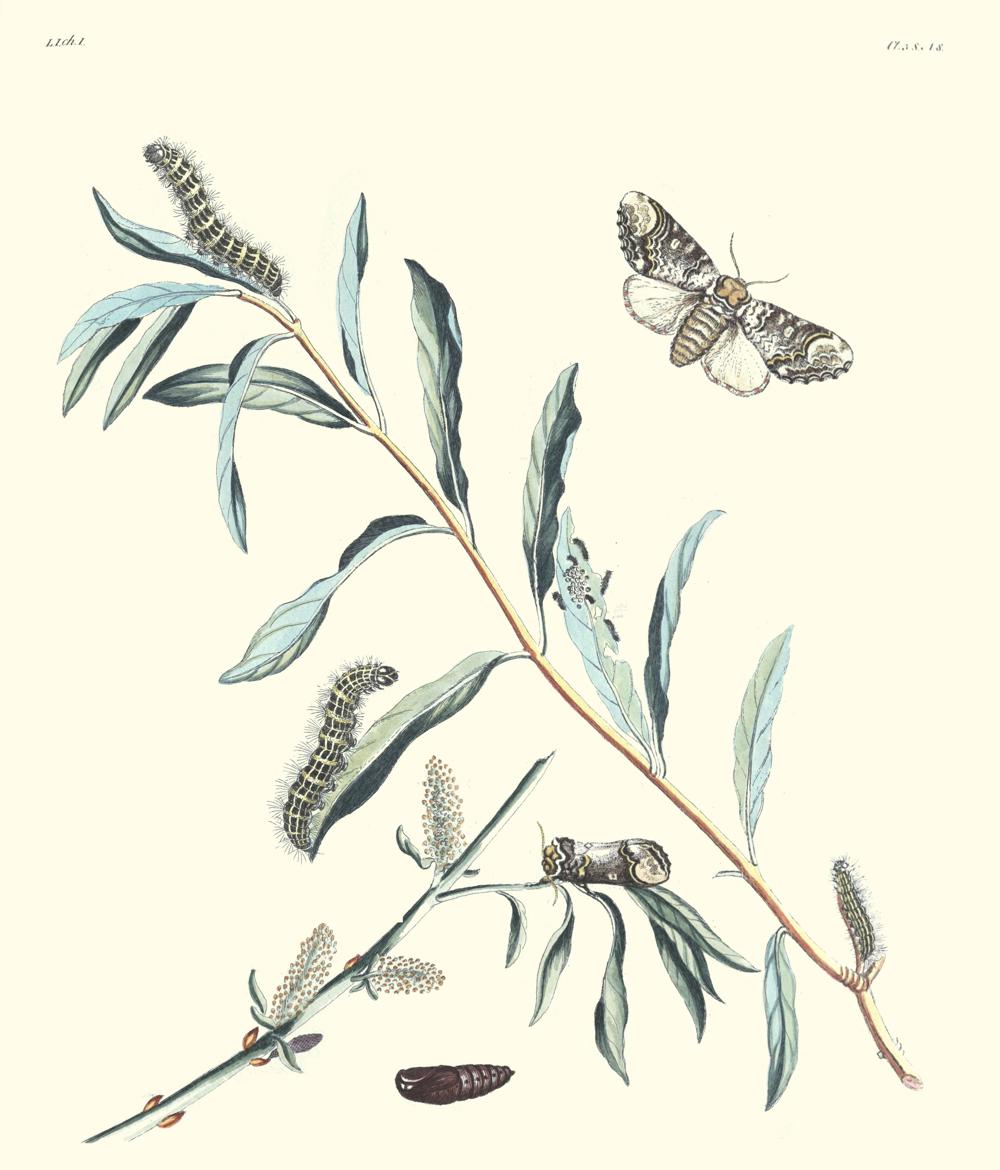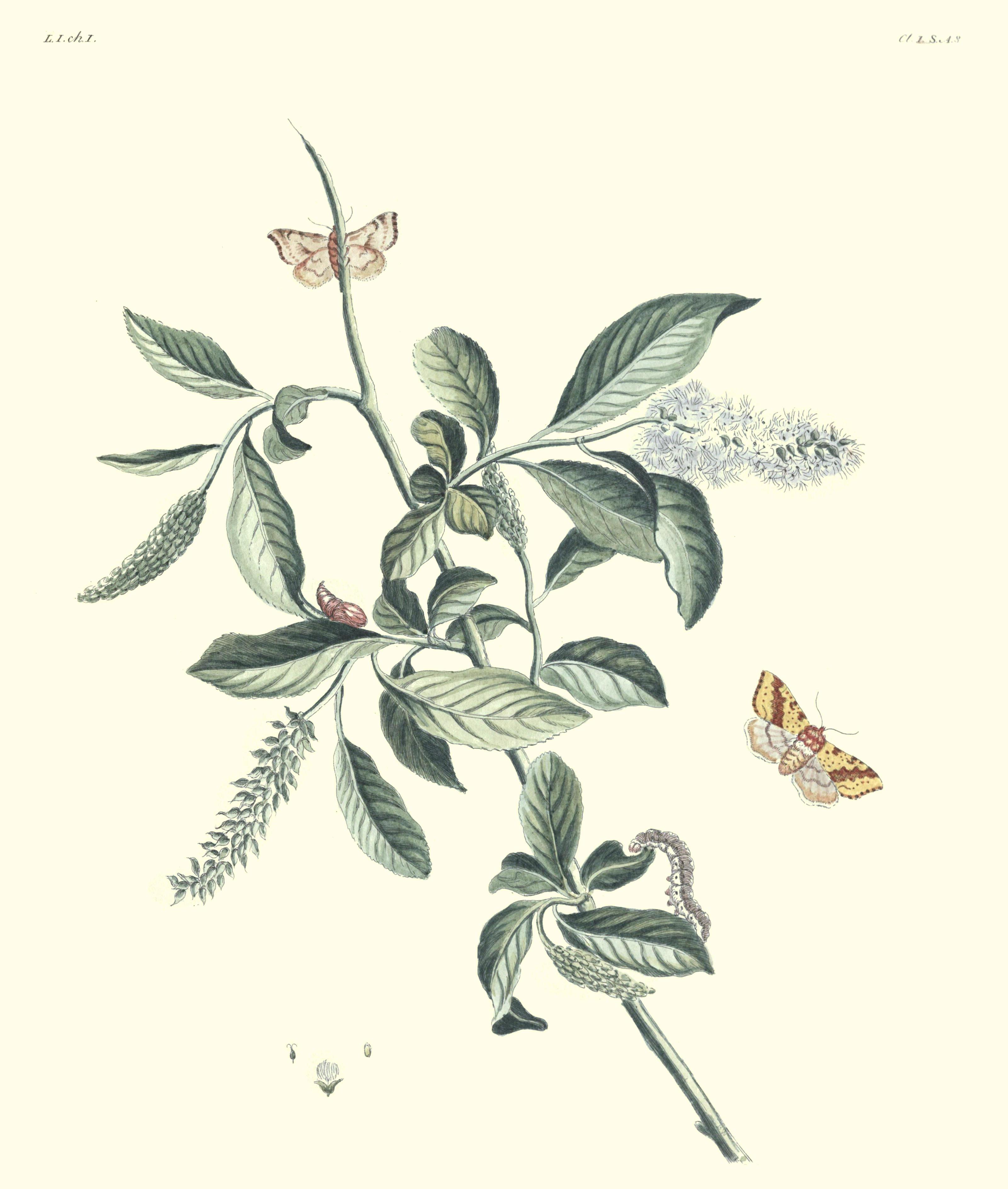 The WILLOW-BUTTERFLY. About the Middle of August, 1748, two of this Species of Butterfly were taken near Camberwell, in Surry: But in all my Practice I have never seen any of them in the Fields; so that they were look’d upon as very great Rarities. They are very common in Germany, and Mr. Rosel tells us, the Caterpillar[59] feeds on Willow, and may be found all the Summer. The Caterpillar and Chrysalis, in the Plate, are taken from a Draught by Mr. Rosel.