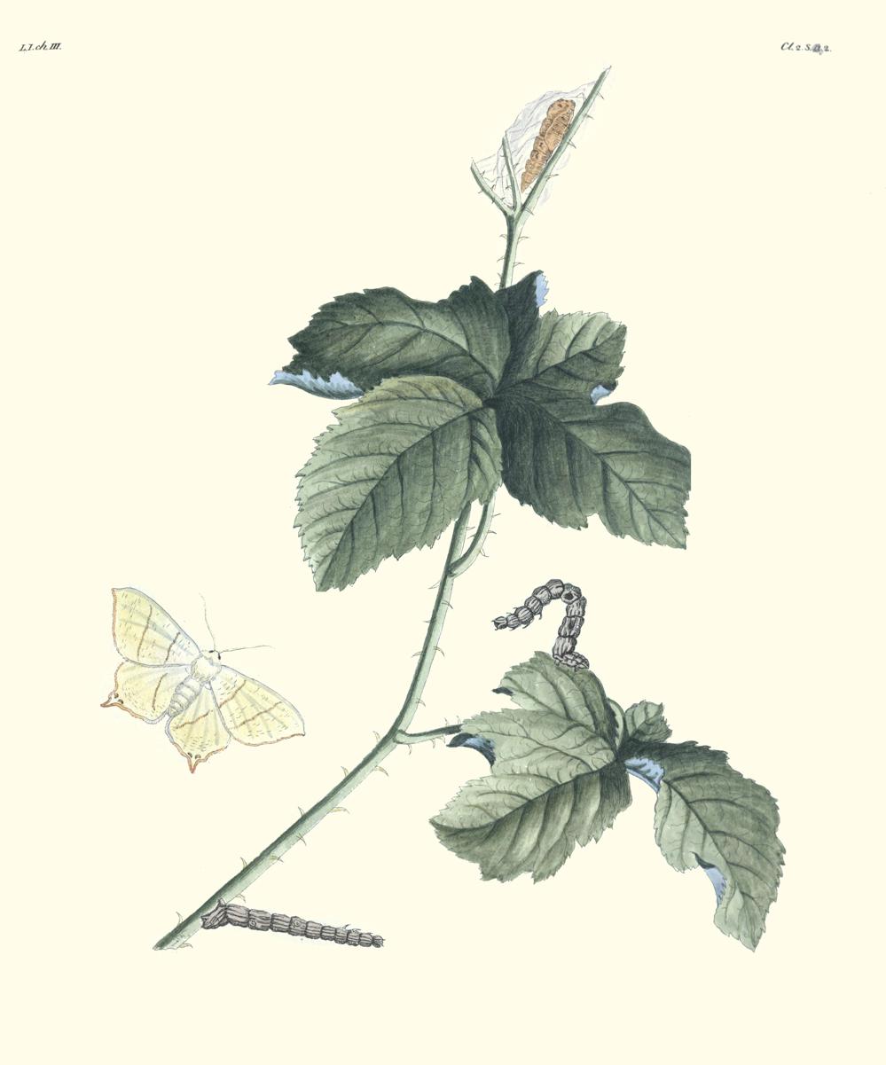 The GREEN BUTTERFLY. Mr. Dandridge took the Caterpillar of this Fly at the Beginning of July, feeding on the inside of the Blackberry Buds, in which it made a small Hole, whereby it entered, and eating all the inward Part, left the Buds seemingly entire: It fed on them till the Middle of July, and then changed to a Chrysalis; and in the Middle of April, the Year following, the Fly was bred. This Butterfly is most common in and near Woods; it delights to settle on Boughs four or five Feet from the Ground, by moving which the Fly will rise, and if not much frighted will settle on or near the same Place again, by which Means you may take it with your Net. The best Time to catch this Butterfly is from the first to the fifteenth of May.