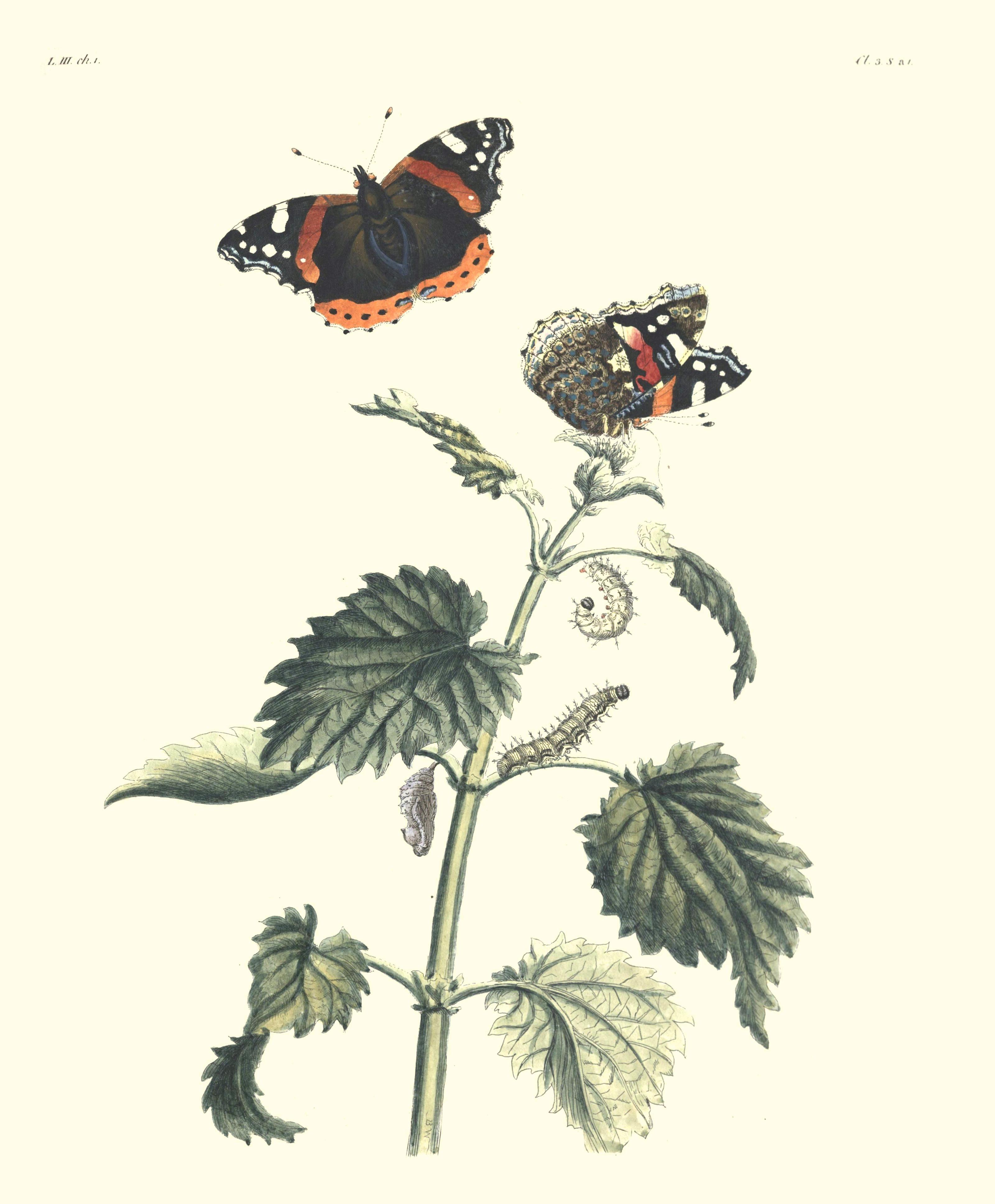 The ADMIRABLE BUTTERFLY. The great Stinging Nettle is the Food of this Caterpillar, which is to be found by observing where the Nettle-Leaves appear to be folded or spun together, for within such Leaves the Caterpillar feeds. It turns in August to a Chrysalis, hanging perpendicularly downwards by the Tail, fourteen Days after the Chrysalis is formed the Fly appears. The Caterpillars shelter themselves after this Manner, that they may be the better secured from the too great Heat of the Sun, from Rain, Birds, and a small Ichneumon Fly, which often hinders their coming to Perfection, by laying its Eggs therein, which Eggs are of such a glutenous Nature, that they stick fast as soon as laid. Some of the Chrysalides appear as if gilded with burnished Gold, but such usually produce not a Butterfly, but a Brood of small, though very beautiful Ichneumons. The Fly may be taken in Gardens and other Places, it feeds on Fruit that lies under Trees, &c. and is no uncommon Fly. It lives quite through the Winter.