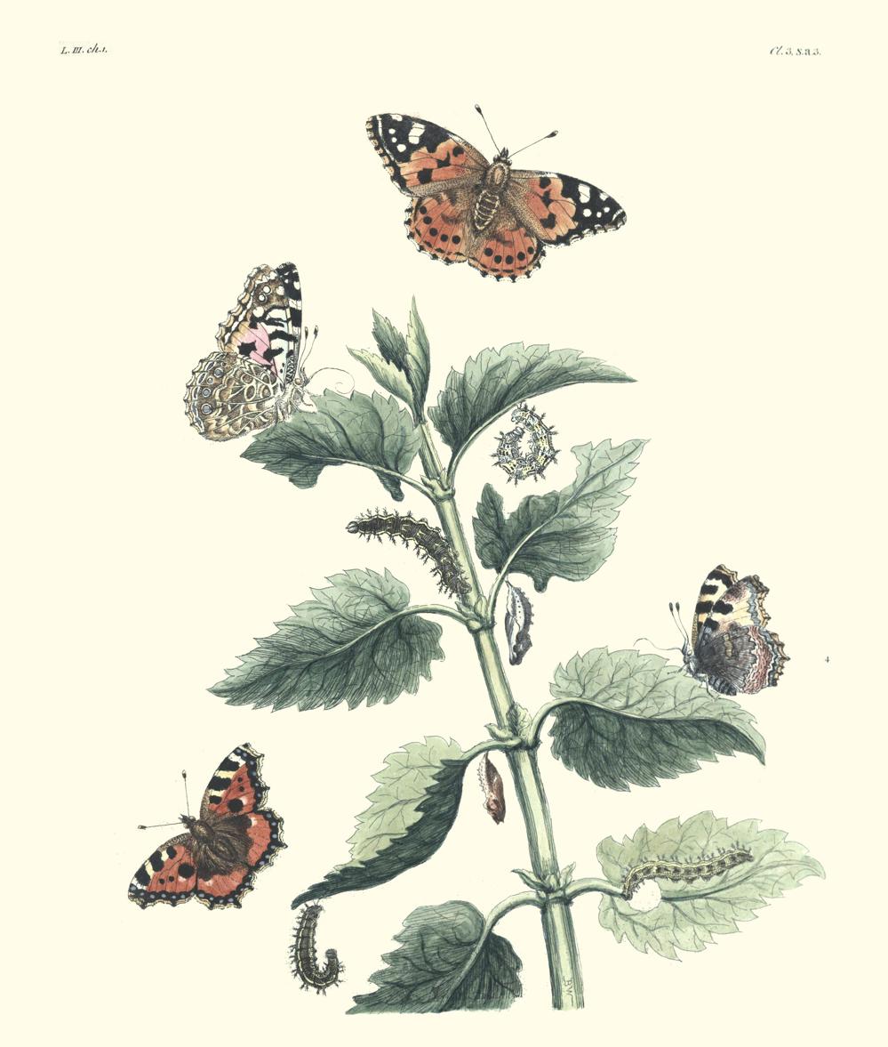 Figure 4 represents, the SMALL TORTOISE-SHELL-BUTTERFLY, which is very common, and breeds twice a Year: The first Brood is towards the End of June, the second about the End of August. The Caterpillar feeds on Nettles, is open and sociable, and may be taken full fed about the Middle of June, and the Middle of August, and is about fourteen Days in Chrysalis. This Butterfly out-lives the Winter.