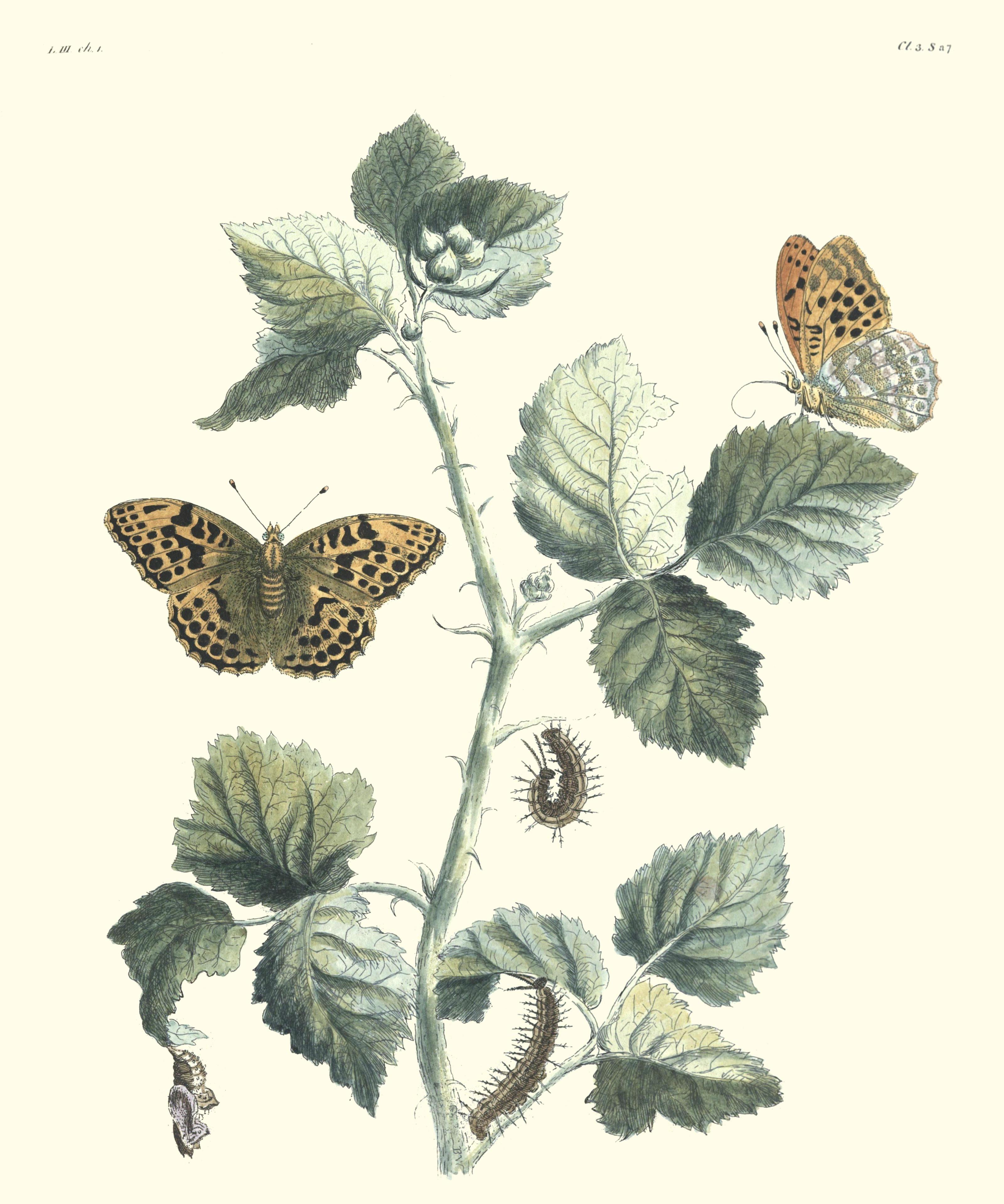 The GREAT FRITILLARY-BUTTERFLY. Mr. Rosel says, the Caterpillar feeds on Nettles, in the private Recesses of Woods, that it changes into the Chrysalis State at the End of May, and that the Fly is produced in June. This Butterfly is very swift in Flight, and is best taken in the Forenoon, when it will settle and feed on Blackberry Blossoms, Thistles, &c. They are most commonly found in Woods, and the Fields adjacent to Woods.