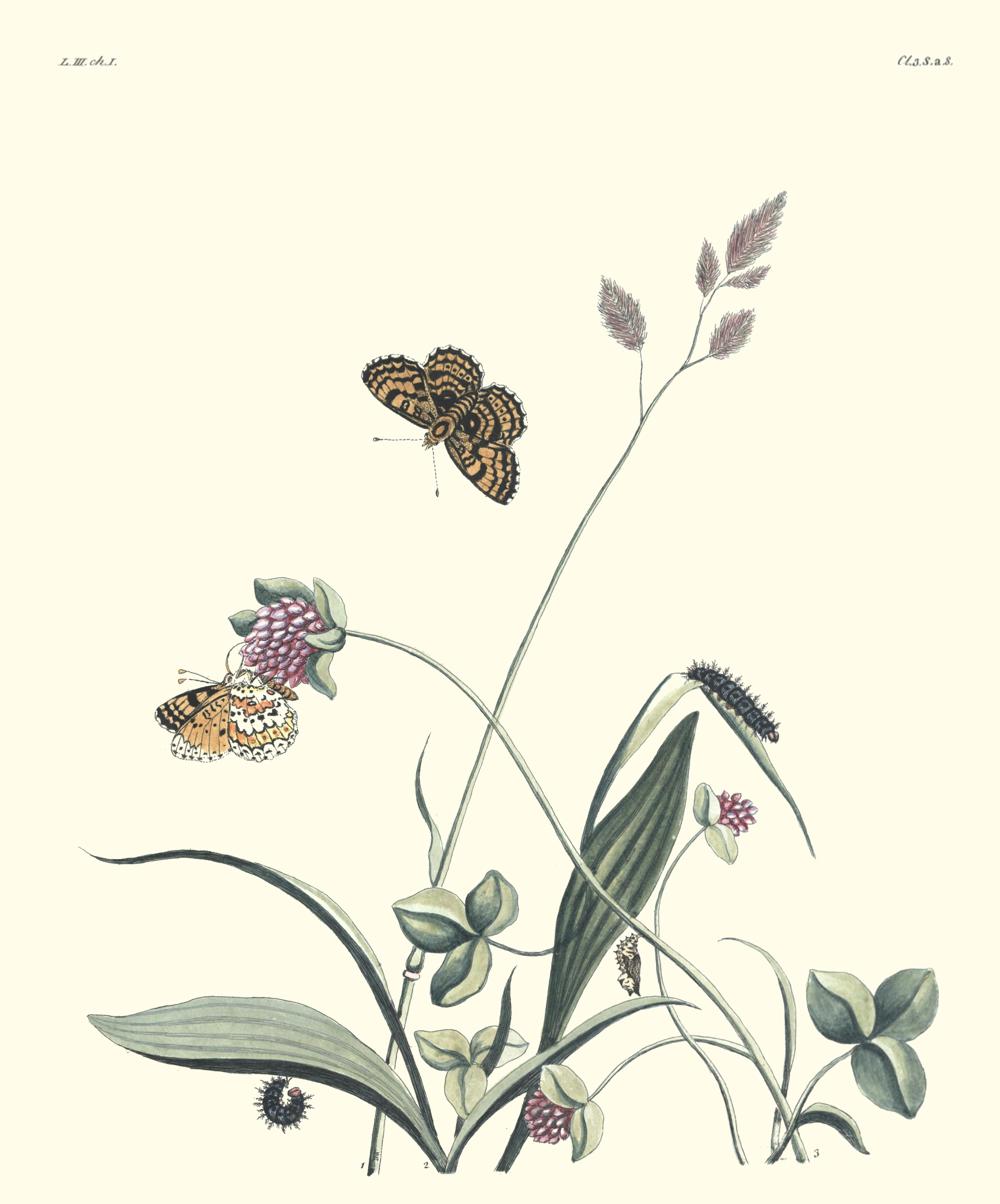 The PLANTAIN FRITILLARY-BUTTERFLY. The Caterpillar hereof feeds on Plantain, Clover, and Grass, changes to a Chrysalis, within a Web of its own spinning, upon the Surface of the Ground, at the Beginning of May, and the Fly appears fourteen Days after. The Caterpillars are sociable, and feed together. They appear of a very timorous Nature, for if you move the Food on which they are, they immediately quit their Hold and fall to the Ground, and there remain in a curl’d up Form till such Time they think the Danger over. The Butterfly is swift in Flight, but may be taken if diligently attended to, in Fields of Hay-Grass, at the Time above-mentioned.
