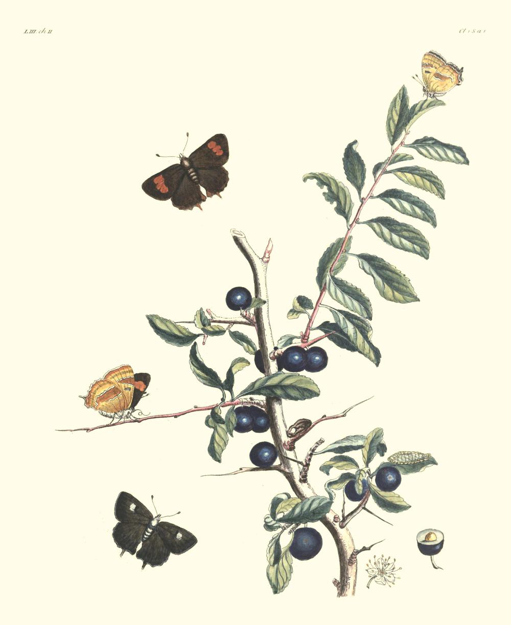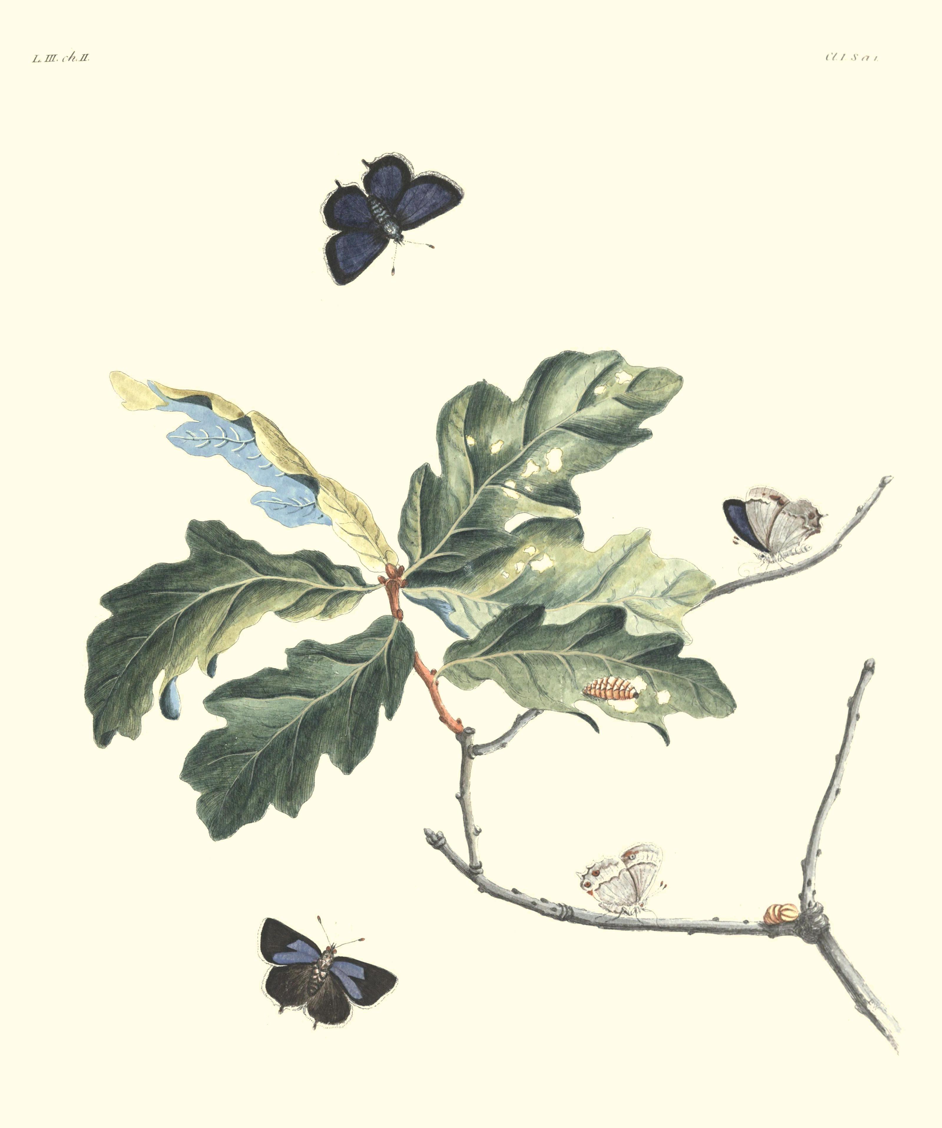 The PURPLE HAIR-STREAK-BUTTERFLY. The Caterpillar feeds on Oak-Leaves, becomes a Chrysalis at the Beginning of June, and in a Month after the Fly appears. This Butterfly is not so easily taken as some others, for when it is not feeding it usually settles high. I have taken the greatest Numbers early in a Morning, when I have found them feeding on the Blossoms of the Blackberry.