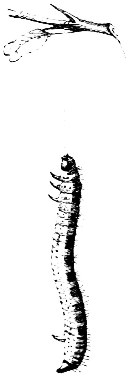 When the caterpillars approach their full size they are too heavy to crawl in search of their food with the back upwards, as is usual with most caterpillars, but traverse the small branches suspended by the feet, as is shown in the figure.