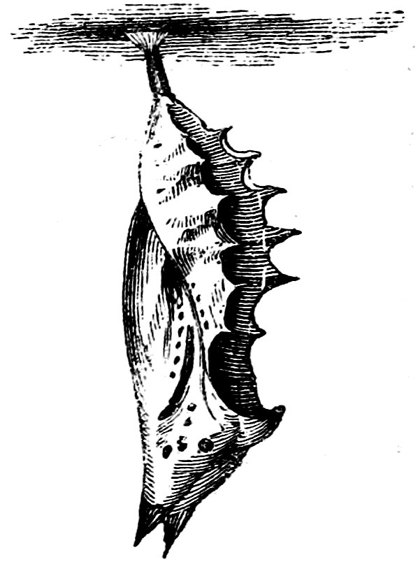 The astonishing task of supplying silk for the whole civilized world is performed almost without exception by the common silkworm, or caterpillar of the mulberry-tree moth. But it must not be supposed that this is the only silk-producing insect. On the contrary, all the caterpillars of butterflies and moths have the power of spinning a certain quantity of silken thread, however small, and however inferior to that of the silkworm, properly so called. It is very common in gardens to see numbers of caterpillars dangling by their silken threads from the young branches of fruit-trees. In this way they let themselves down, or break their fall if blown off by the wind, or otherwise shaken from their favourite tree. And in the case of some caterpillars 11when the insect has completed the term of its existence and becomes a chrysalis, it suspends itself by silken cords to some fixed point, where it remains in complete repose, without food, perhaps for months before the perfect winged insect bursts forth, as different a creature from the caterpillar as the chrysalis is from either,—and yet these are but three different states of existence of the same insect.