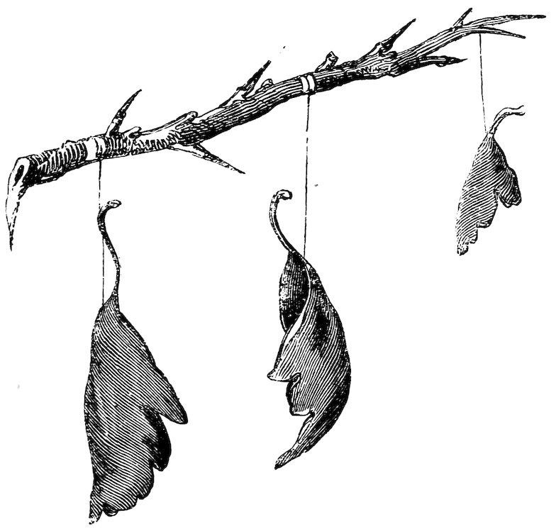 When the caterpillar is ready to spin its cocoon, it connects by means of the silk, (which is always glutinous when newly spun,) two or three new leaves into an outer envelope, which serves as a basis to spin the complete cocoon in, besides the cocoon being suspended from a branch of the tree 25in a wonderful manner, by a thick, strong, consolidated cord, spun of the same material by this persevering creature.