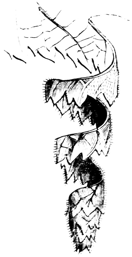 There is also a very curious and beautiful nest formed by a rare insect, which has only yet been observed in its caterpillar state; but its proceedings therein are interesting and highly remarkable. The length of the body in this caterpillar varies from six to eight inches, the thickness is half a line. The general colour is bluish green, tending to yellow about the head; the feet are black, and six in number. At the extremity of the body are two points projecting sideways. The eyes are visible and prominent in this caterpillar, and besides the antennæ there are two or three pairs of palpi or feelers, which perform the office of hands. This insect inhabits the nut-tree, and cuts out from its leaves a most ingenious case, which serves for its dwelling-place. This case is of a singular form, being an elongated cone, very narrow at the extremity, and tolerably wide at the orifice. It is formed of a strip of nut-leaf, wound up in a spiral manner, but so cleverly contrived that the strip is very narrow at the extremity, and gradually widens as the work proceeds. This happens from the gradual progress of the work, which is begun in the early stage of the caterpillar’s existence, when it does not require a large dwelling-place, and becomes more and more extended to suit the growth of its inmate. When 18it is completed, it is rather more than an inch long, and two lines in diameter at the orifice. The outside of the case presents the upper surface of the leaf in which the indentations are preserved. The dwelling is a spacious one for the caterpillar, so that it can turn round in it with perfect ease. The band of which the cone is composed is taken from the edge of the leaf, which the caterpillar cuts away in proportion as it winds it round its own body. When one portion has taken the required form, a little more is cut out, but always in a direction parallel with the edge of the leaf. While the insect is thus gradually rolling itself up in a case, it also feeds vigorously on the leaf, taking care, however, always to spare the band which forms its habitation. Another part of the cleverness of this insect consists in maintaining this strip of leaf in its spiral form, which would otherwise naturally unwind by its own weight, and flutter in the wind as a torn fragment. Here it is that silk is again skilfully employed. The caterpillar commences much as other leaf-rolling insects do, by fastening a thread to the edge of the leaf and drawing it towards the desired point. But as the work proceeds the insect generally has three skeins or bands of silk extended from the opening of its case to the leaf. The first is the shortest and the most direct, issuing from the interior of the roll; the second is fastened to the middle of the last spiral, and extends to the leaf; the third is more extensive still, and all three are admirably disposed for keeping the leaf bent to the proper form. These skeins are composed of a great number of threads parallel with each other, which not only serve to retain the leaf in its spiral form, but also serve the caterpillar as a kind of ladder, by which it mounts, and on which it rests while cutting out fresh portions of leaf.