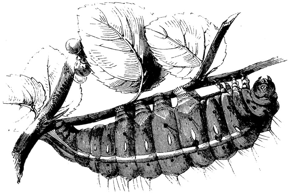 When the caterpillar has attained its full growth, it is a very different creature from the little black worm which first issued from the egg, being from two and a half to three inches in length, and its body consisting of twelve membranous rings, 41which contract and elongate as the animal moves. It is furnished with sixteen legs, in pairs: three pairs in front, under the first three rings, are covered with a shelly or scaly substance; the other five pairs, called holders, are furnished with little hooks, which assist the insect in climbing. The head is covered with a scaly substance similar to the covering of the fore legs. The mandibles are of great strength, and indented like the teeth of a saw. Beneath the jaw are two small openings, through which the insect draws its silken lines. The substance of which the silk is composed is a fine yellow transparent gum, secreted in two slender vessels, “which are wound, as it were, on two spindles in the stomach; if unfolded, these vessels would be about ten inches in length.” The insect breathes by means of eighteen holes or spiracles, distributed along the body, nine on each side. On each side of the head, near the mouth, are seven small eyes; the two specks higher up on the head, which are generally mistaken for eyes, are only parts of the skull.