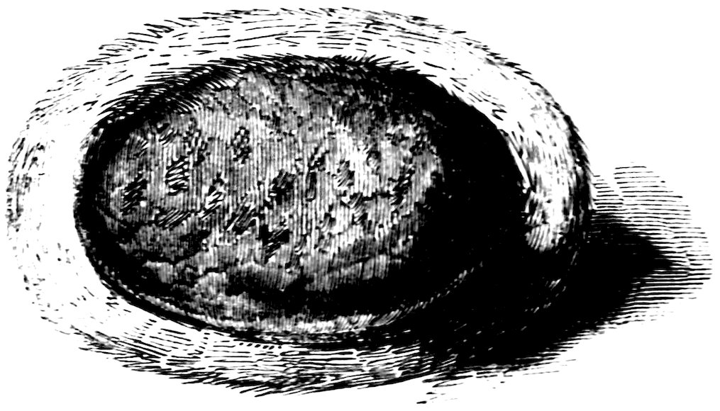 The interior of a humble bee’s nest has none of the beauty and regularity of the hive. Instead of a number of vertical combs of wax there is a confused and clumsy assemblage of egg-shaped bodies of dirty-coloured wax, placed one above the other, forming a series of horizontal combs, resting upon each other and connected by small pillars of wax. These egg-shaped bodies are of different sizes; those in the middle being the largest, closely joined to each other, and each group connected with those next it by slight joinings of wax. These oval bodies are the silken cocoons spun by the young larvæ; some are closed at the top, and include inmates; others, chiefly in the lower combs, are open, the young bees having escaped from them. 92On the surface of the upper comb are several masses of wax of a roundish and irregular form, about an inch and a quarter in diameter and half an inch deep; these are brood cells, containing each six or seven large larvæ, lying close together upon a quantity of pollen and honey placed there for the purpose of nourishing them as soon as they are hatched. When the food is consumed, the workers make an opening in the top of the cell and introduce a new supply, taking care to seal up the cells again. The cells are sometimes split open as the grub increases in size, upon which the workers fill up the cracks with wax, as fast as they occur. It is a curious fact, that these insects make use of the empty cocoons as honey-pots, first lining them with wax, and strengthening them round the edges with a waxen ring. Some nests contain as many as fifty or sixty of these honey-pots, containing stores for daily use, and which are never sealed over like the cells of the hive bee, because all the colony except one female dies at the approach of winter, and this solitary female lies in a torpid state during that season.