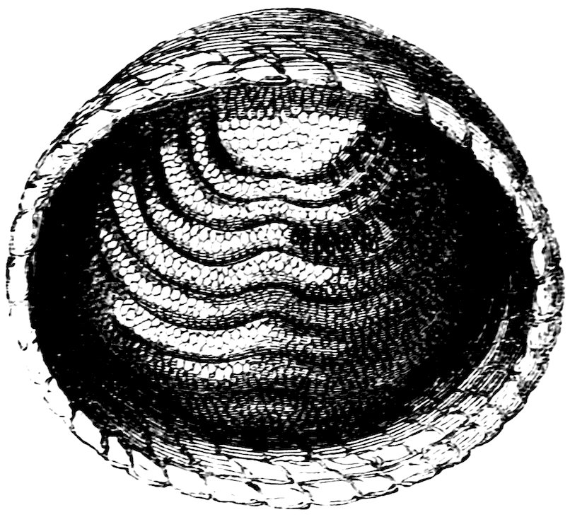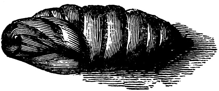 Silkworms are so little disposed to wander away from their food that open trays are sufficient to secure them: but unless great cleanliness is observed in their management, and frequent change of food given, a sickly smell is observed, and the caterpillars languish and die in great numbers. Supposing the young brood goes on well, and is properly attended by the child whom we have supposed to undertake the charge, there will be 37about five or six days’ feeding, and then the worms will begin to sicken for their first moult, or casting the skin. Silkworms have four of these moults, at each of which they appear to suffer pain or inconvenience; they also entirely leave off eating for two or three days. The caterpillars at that time raise the fore part of their bodies, and show tokens of uneasiness. They have grown rapidly, and their skins, not having grown in proportion, now appear to press and inconvenience them; but after two or three days fasting, they become thinner and are able gradually to rid themselves of their skin. It is now that their owner may see the use they begin to make of their silk. By watching them closely he sees each caterpillar throw out a number of very fine silken lines, by which it fastens the skin to one spot. Having done this, it is able to creep out, without dragging the skin about after it, as would otherwise be the case. In this operation the whole covering of the body, including that of the feet, of the jaws and teeth, is cast off; but it sometimes happens 38that the animal cannot entirely cast its skin, a portion of it breaking and remaining attached to the extremity of the body. As the animal increases rapidly in size, this portion of the old skin compresses its body tightly, causing inflammation and much suffering, which usually ends in death.