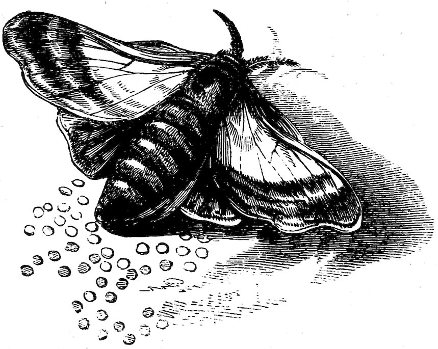 “There is scarce anything among the various wonders which the animal creation affords more admirable than the variety of changes which the silkworm undergoes; but the curious texture of that silken covering with which it surrounds itself 52when it becomes a moth, and arrives at the perfection of its animal life, vastly surpasses what is made by other animals of this class. All the caterpillar kind do indeed undergo changes like those of the silkworm, and the beauty of many of them in their butterfly state greatly exceeds it; but the covering which they put on before this change into a fly is poor and mean, when compared to that golden tissue in which the silkworm wraps itself. They indeed come forth in variety of colours, their wings bedropped with gold and scarlet, yet are they but the beings of a summer’s day; both their life and beauty quickly vanish, and they leave no remembrance after them; but the silkworm leaves behind it such beautiful, such beneficial monuments, as at once record both the wisdom of their Creator, and His bounty to man.”