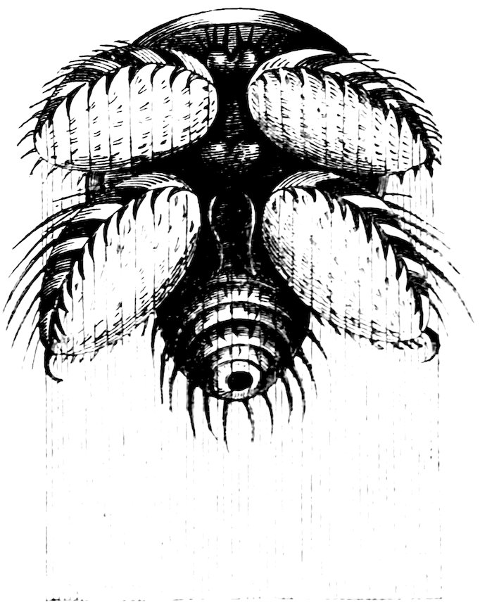 Among leaf-rolling caterpillars, one of the most curious is described by Bonnet, in which the 16nest hangs suspended from the branch of a fruit-tree by a strong silken thread. It is formed of one or two leaves neatly folded and fastened together with silk, and in this small enclosure several caterpillars live harmoniously together.