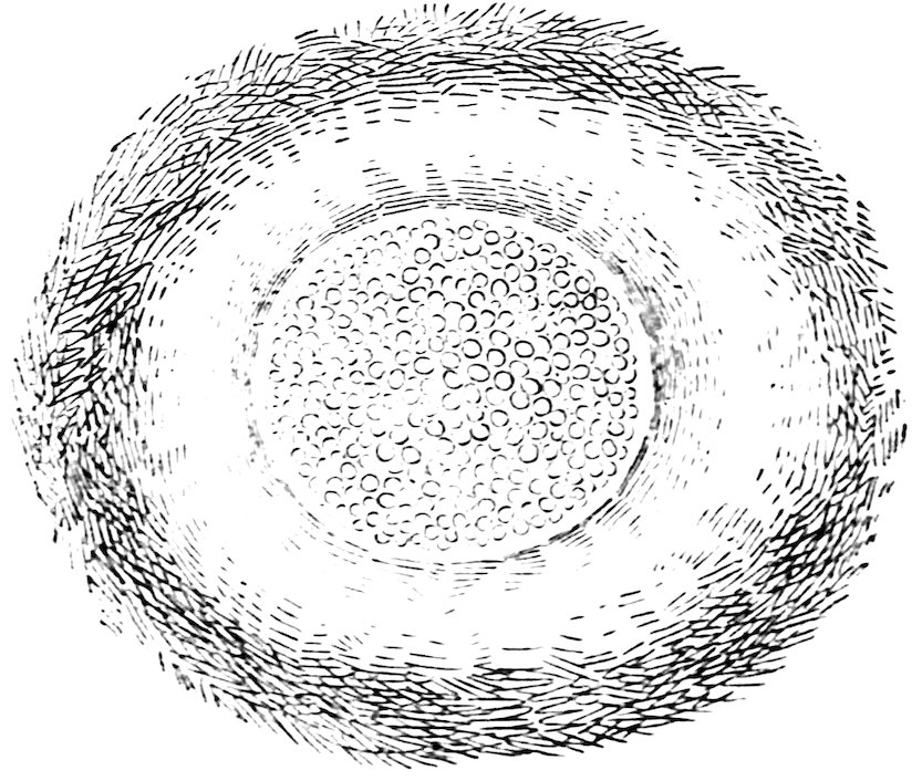 On pressing the body of a spider, the liquor flows into these nipples, by applying the finger against which, distinct threads may be drawn out through the numerous openings; and, what is very astonishing, every separate thread is made up of innumerable smaller threads, so that Réaumur thought himself far within the limits of the truth when he stated that each of the five 57nipples supplied one thousand separate fibres, in which case the slender filament of the spider’s nest must be made up of five thousand fibres. By applying the whole, or a part, of this apparatus to her work, the spider can make the thread stout or fine at pleasure: thus the webs for entrapping flies are very slight and fragile; but the nest for securing the eggs is much stronger, to afford them shelter from the cold. The threads are wound loosely round the eggs in a shape similar to that of the silkworm’s cocoon. The colour of the silk is generally grey, becoming blackish on exposure to the air: sometimes it is pale yellow, and also of very fine quality; but this is the production of comparatively rare species, which could not be depended on for the purposes of manufacture. A spider’s nest preserved by the writer during the last winter was of a beautiful yellow, almost approaching that of the cocoon of the silkworm. As spring approached it increased in bulk and became rather paler, until at last a dark appearance in the centre betokened the bursting of the eggs. 58At the present time (April 10th) ninety-six small yellow-bodied spiders have come forth, and are actively engaged in weaving their delicate webs across the glass which contains them. A muslin cover admits air to the interior, and these minute insects appear perfectly healthy although deprived of their natural food. Some sugar was placed in the glass, but they do not appear to have consumed any of it, although some of them have been hatched for more than a fortnight. From the appearance of the nest, more of these spiders yet remain to be hatched.