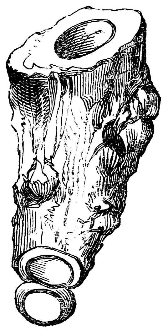 Among the species of gall to which our oaks are subject, there are some which grow at the end of the twig, as for instance, that called the artichoke-gall, which comes the nearest in appearance to the nut-gall of commerce, since it is, in common with that nut, an irregular development, not of the leaf or flower, but of the bud. The artichoke-gall 152might indeed be easily mistaken for the fruit of the tree, by any one unacquainted with the habit of the oak. It is a cone-like body, consisting of a number of leafy scales overlapping each other, but on being dissected it is found, like other galls, to contain insects in various stages of their growth, according to the season. In the same way, the nut-gall, being a disease of the bud, or extremity of the young shoots of the oak on which it grows, has the appearance common to some other kinds of fruit, and would seem to be the ordinary produce of the stalk, did we not find that acorns also grow on the same tree. The hard and brittle texture of the gall-nut also, so different from the substance of our own oak-galls, would be still more likely to deceive, and indeed has deceived a highly respectable writer, who declares from his observation of the dried galls of commerce, that the nut is the fruit of a tree, and not a mere excrescence.[4]