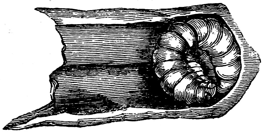 Worms that have newly moulted are readily distinguished by their pale colour, and the wrinkled appearance of the new skin. Soon after moulting they recover health and vigour, and feed with increased appetite. To keep them in health they must be fed with great regularity, and not crowded together in their trays. In the course of five days the rapid growth of the insect causes the wrinkles to disappear from the skin; it is now half an inch in length; a second sickness, and a second moulting, prepare it for increase of growth; it casts its skin as before, and feeds without intermission during another five days, during which time it attains a length of three quarters of an inch. It then falls sick and moults a third time. 39It again feeds during five days, after which it casts its skin for the fourth and last time in the caterpillar state.
