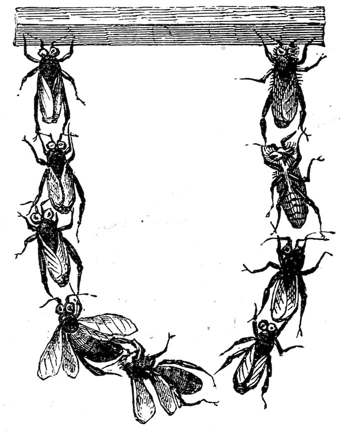 The particles emitted by these insects are so very corrosive that persons are liable to be violently affected who attempt to gather them with bare hands during the heat of the day. It is also dangerous to be under a tree where a swarm has gathered. Persons who collect them should always wear a mask and gloves.