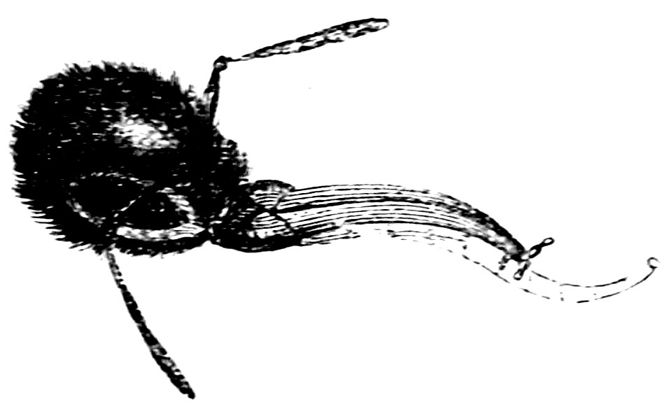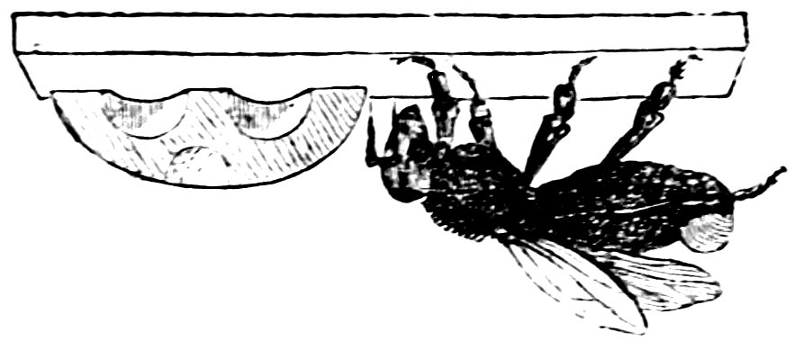 Early in spring, as soon as the catkins of the willows are in flower, a large solitary female may be seen about them collecting honey and pollen. She is the only survivor of the former year’s colony, and is the foundress of a new one. Her first care on awaking from her winter’s sleep is to excavate a hollow in the earth for her nest, which 90is often above a foot under the surface, and is entered by a passage or gallery. When complete, she lines it with soft leaves, and then proceeds to make her waxen cells. This she does so quickly,[2] that she can build a cell, fill it with honey and pollen, deposit one or two eggs in it, and cover them in, in little more than half an hour. A number of these cells are thus constructed; the eggs are hatched, and the little worms, increasing rapidly in size, at last spin silken cocoons, and undergo the usual changes. The workers are the most numerous portion of the population, and have abundant employment throughout the summer. One of their first cares is to line the roof of their nest with wax, to keep it warm and prevent water from filtering through. The wax of these insects is not so delicate, white, firm, or fusible as that of the 91hive bee, nor is it applied to such exquisite architecture; it is brown and soft, but well adapted to the rude works of their nest. It is formed in wax-pockets similar to those of the hive bee, and is moulded in plates to the shape of the insect’s body. Unlike the queen of the hive, the foundress of this colony secretes wax, and does so even more abundantly than one of her workers.