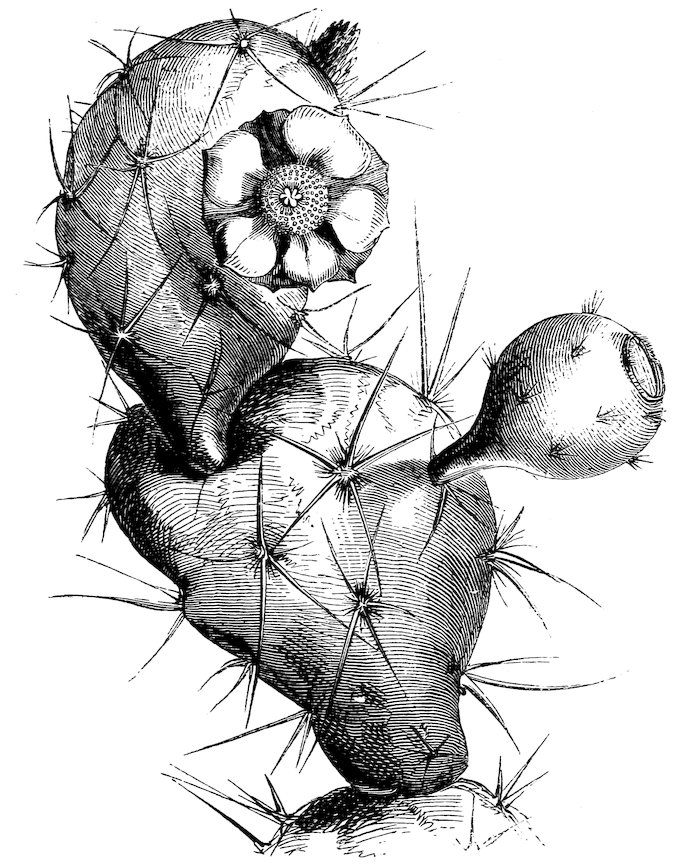 122After innumerable difficulties and dangers this traveller reached St. Domingo in safety, but with only a small part of his insects living. These, however, he was successful in rearing and multiplying until a flourishing nopalerie was established. He found, by experience, that five or six species of cactus opuntia will nourish these insects, but that some are far more valuable than others. He also proved that the colours of the flowers and fruit of the plants, whether red, violet, yellow, or white, did not in any way affect the colour of the cochineal, nor indicate the greater or less aptitude of the plant to nourish the insect. The thorny species were less convenient on account of the pain and annoyance to the hands of those who managed the nursery; but in some of these the younger branches were nearly free from prickles.