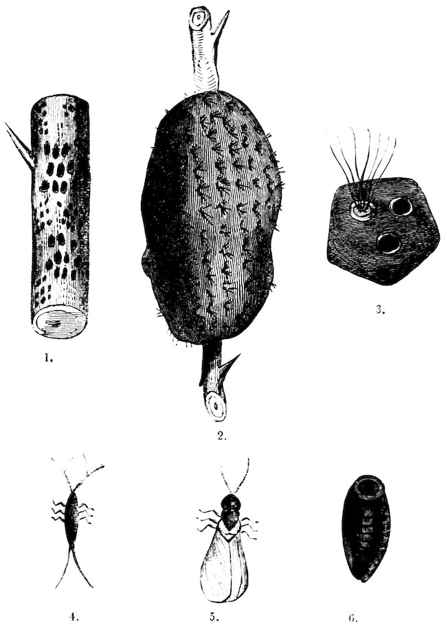 1. BRANCH COVERED WITH LAC. 2. SMALL TWIG LADEN WITH LAC. 3. PORTION OF LAC (magnified). 4, 5, 6. LAC INSECT IN ITS SEVERAL FORMS.