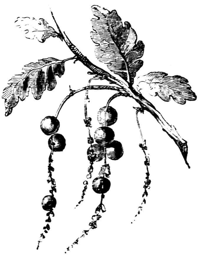 Still more singular is the gall found in the catkins of the oak. The flies deposit their eggs in the stalk of the stamen-bearing flowers, which in consequence become adorned with what appear to be straggling bunches of currants or bird-cherries. Placed at short distances from each other on the thread-like stem, these excrescences so much resemble 151currants in size, shape, and mode of growth, that they have been named “currant galls.”