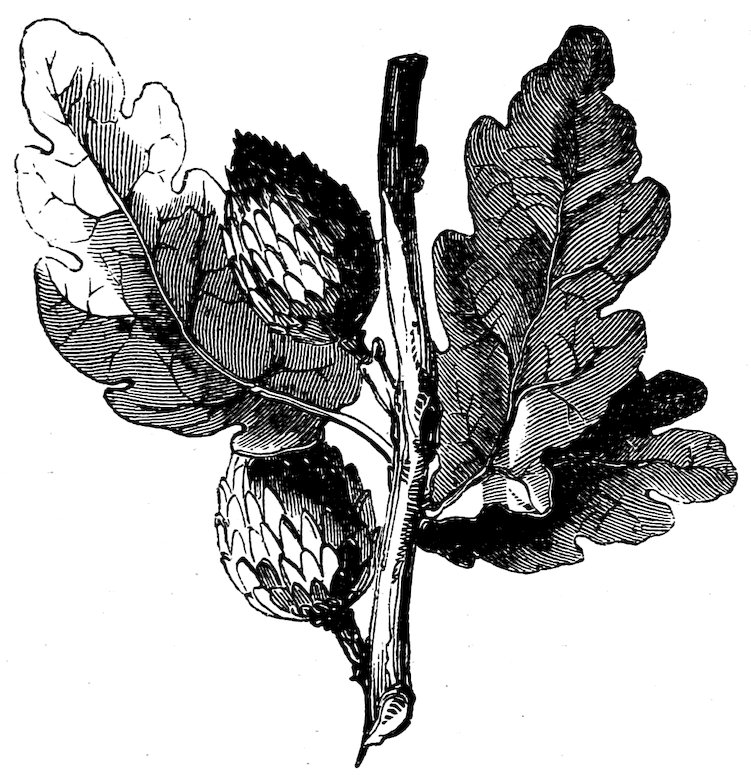 The oak which furnishes this gall is common throughout Asia Minor, from the Bosphorus to Syria, and from the shores of the Archipelago to Persia. It is more frequently seen under the form of a shrub than a tree, rarely attaining six feet in height. Its leaves are smooth, toothed at the edges, of a clear green on both sides, and having a very short leaf-stalk; they fall every year, at the end of autumn. The acorn is two or three times longer than its cup, the latter is sessile, slightly downy, and furnished with small scales. The gall is hard, woody, and heavy, growing out of the buds of young branches, and acquiring a diameter of from four lines to an inch. It is generally round, and covered with knots, some of which are pointed.