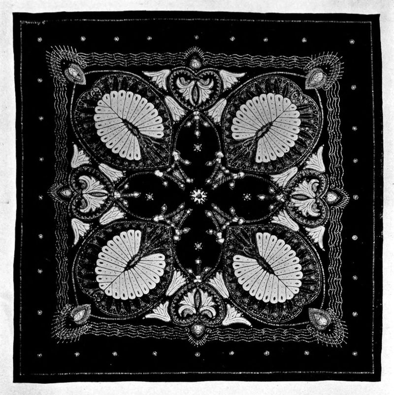 When the tjaps are finished and found correct, that is, when every little line on one die[11] is found to correspond exactly with the same line on the reverse block, then it is the business of the printer to print the tjaps so that no difference is shown in the design. The making of a pair of tjaps is only necessary when an irregular design is to be produced, as in the case of a symmetrical pattern the same die can be used on both sides.