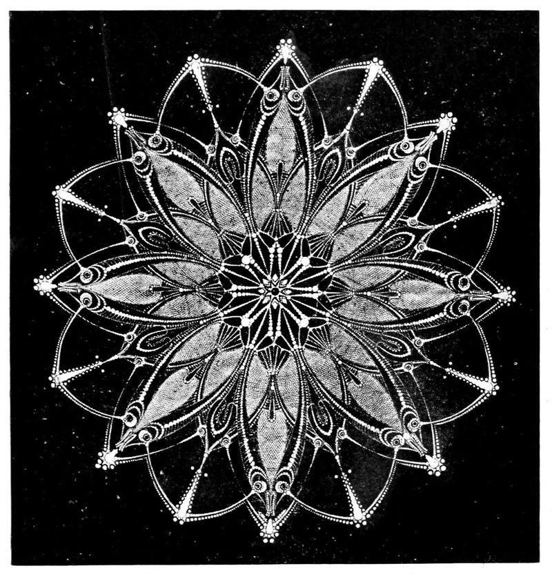 By graduating the size of the dots, from small to large, an effect is produced that never could be obtained with lines; not only are the lines treated in this way, but whole surfaces in which a light tone is desired, instead of being “covered off” with a brush, are laid in with countless dots very close together. As can be readily understood this hand-work requires the acme[29] of craftsmanship, for if the dots are placed irregularly, that is to say, if their arrangement is not directly harmonious with the main lines of the design, the pattern formed by the spaces between them, would disturb the rest of the drawing.