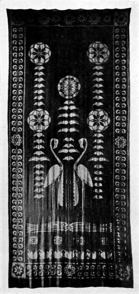 For two hundred and seventy odd years it has been known in Holland, to which country it was brought by the Dutch traders from Java in the middle of the seventeenth century. It was not, however, received very enthusiastically and the commercial failure that followed the importation of some 2000 pieces (which were finally sold at auction, as no market could be found for them through regular channels) did not encourage traders in their efforts to popularize batiks. From that time, that is, about 1750 until 1817, interest in the work decidedly flagged and the honour of reviving it[25] must be given primarily to Raffles who gave a description of it in his well known “History of Java” published at the latter date. He, however, seems to have had very little personal feeling for the art and merely wrote it up as a matter of history, and it remained for the modern artists to give it is first real impetus.