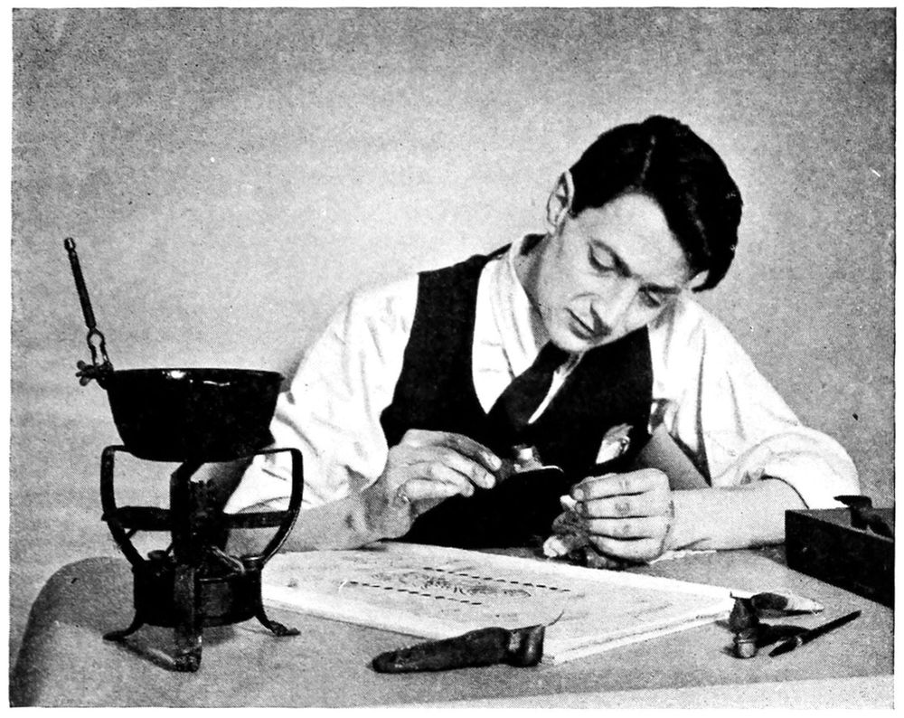 This fine work is easier with shaped brush; this shaping is done without much difficulty by dipping the brush, preferably a good sable one, into hot wax, and, without pressing the globule formation out of shape, gently wiping the excess of wax from the distended bristles. Allow this to cool and when hard, trim to a point with[37] a sharp knife. Melt the cold wax out by dipping in the wax pot and you will have a brush that will be more manageable and will hold more wax for the size of its point, than one would have with the regular unshaped brush. For covering big surfaces, one or two flat soft-haired varnish brushes will be needed.