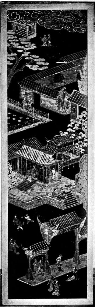 The frontispiece shows a piece in which all the line work was done with a tjanting, the brush only being used to fill in the big surfaces,[35] after the various dippings. The design is an adaptation from the Chinese, inspired by the decoration on a coramandel screen. The panel is worked out in seven colours: two golds, two greens, red, brown, and black. It was designed by the writer and executed by Emile Weeckers and himself.