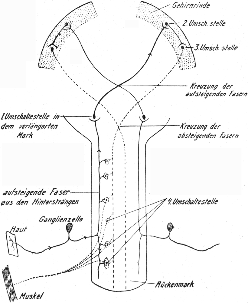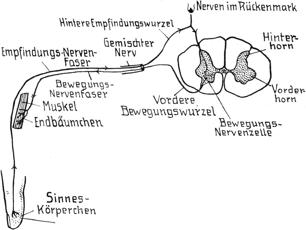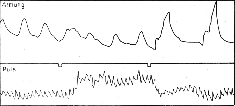 Nach traumlosem, tiefem Schlafe, dem wir bewußtlos hingegeben waren, erwachen wir und mit uns die bewußte Tätigkeit unseres Geistes. Wir wissen von uns selbst, erkennen Teile der Außenwelt, wir sind bei Bewußtsein. Im Bewußtsein beginnt nun die Verarbeitung von Reizen der Außenwelt; denn an Auge und Ohr treten Äther- und Luftschwingungen. Die Sinnesnerven leiten die Reize weiter,[4] und im Gehirn haben wir Empfindungen.[S. 7] Darunter versteht der Forscher ein kühles Kenntnisnehmen von dem Reiz, das in Wirklichkeit so kühl gar nicht vorkommt. Wenn wir durch sinnreiche Apparate den Puls eines Menschen aufzeichnen lassen und zeigen ihm eine einfache Farbe, etwa Blau, oder lassen einen Ton erklingen — sofort zeigt der Puls Veränderungen,[S. 8] weil das Herz durch Gefühle etwas beeinflußt ist. Schon daraus sehen wir, daß mit den einfachsten Empfindungen schon Gefühle verknüpft sind. Reine Empfindungen, also bloßes kühles Kenntnisnehmen von Reizen ohne Gefühlsbegleitung, gibt es nicht. Der Seelenforscher aber muß die verwickelten geistigen Vorgänge zergliedern und unterscheidet deshalb scharf zwischen Empfindung, Gefühl und Willen. In Wirklichkeit hängen diese drei Elemente des Bewußtseins eng verbunden miteinander zusammen. Wie eng, das werden wir noch in diesem Abschnitt erkennen.